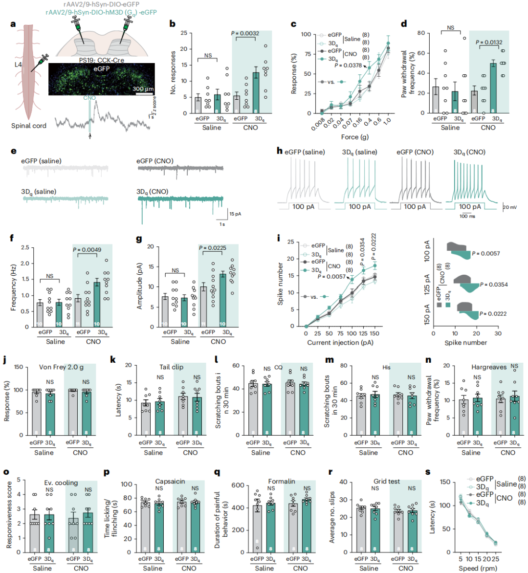 针对PS19小鼠脊髓CCK神经元活性降低的现象,研究向PS19;CCK-Cre小鼠脊髓双侧注射Cre依赖型rAAV2/9-hSyn-DIO-hM3D(Gq)-eGFP病毒,使hM3D(Gq)特异性表达于CCK神经元(图5a)。给予CNO激活该神经元后,小鼠触觉响应部分改善(图5b-i),且不影响其他感觉及运动功能(图5j-s)。