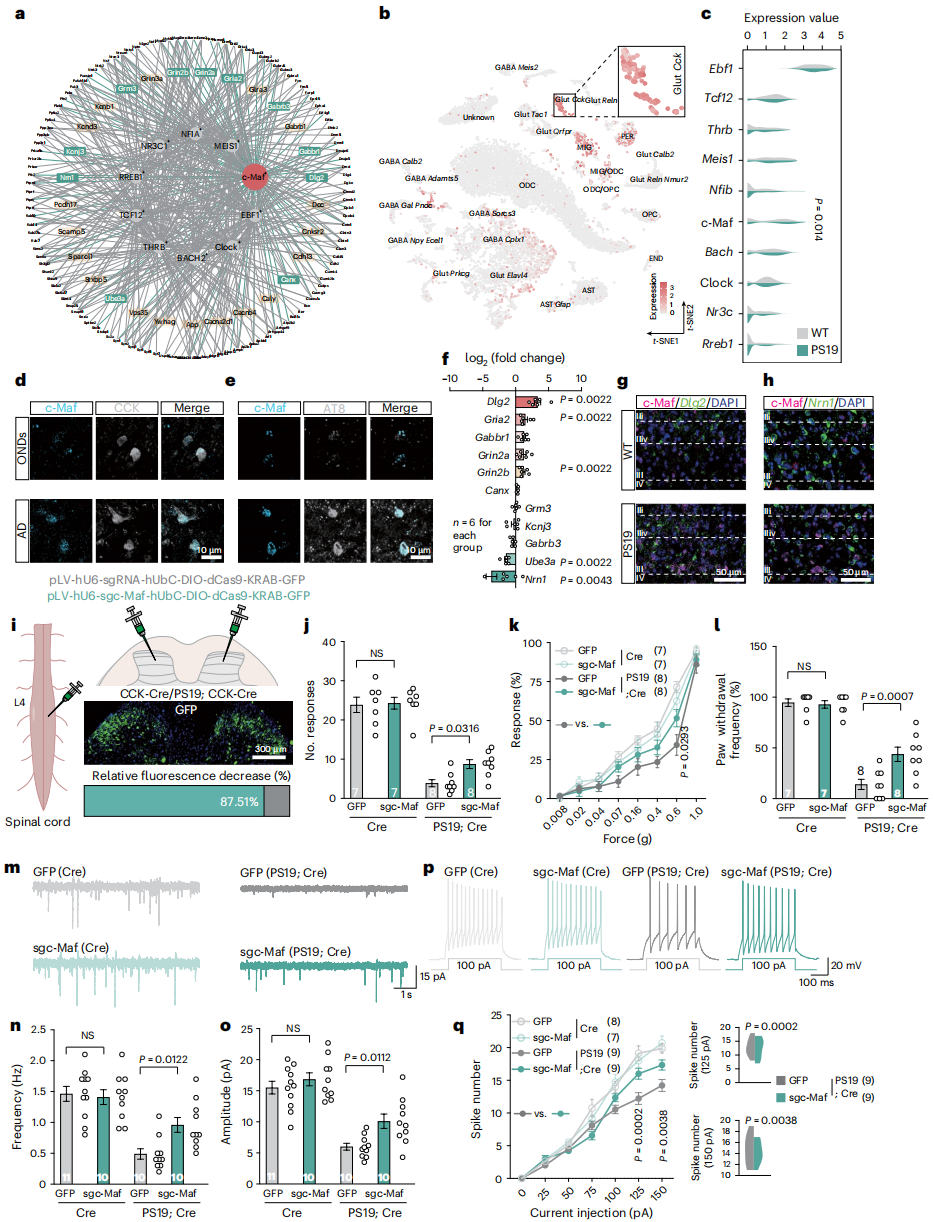 为了探究机制,分析snRNA-seq数据发现CCK神经元中多个活性及突触相关基因异常,通过Python单细胞调控网络推断与聚类(pySCENIC)流程筛选出10个关键调控子(图6a-c),其中c-Maf因以下特性成为核心靶点:(1)参与感觉神经元及脊髓背角III/IV层神经元发育;(2)调控子在CCK神经元中高度富集;(3)PS19小鼠与AD患者脊髓背角IIiv-IV层CCK神经元中c-Maf表达升高(图6d);(4)与pTau水平正相关(图6e);(5)调控皮质网络兴奋性。进一步证实,c-Maf转录调控Dlg2、Nrn1等活性相关基因,而这些基因在PS19小鼠脊髓CCK神经元中存在异常表达(图6f-h),且Tau病理可调控c-Maf及其下游靶标表达。为了进一步明确c-Maf在AD小鼠触觉缺陷中的关键作用,向PS19;CCK-Cre小鼠注射靶向c-Maf的dCas9-KRAB/sgRNA慢病毒(图6i),可恢复其触觉测试表现(图6j-l)及CCK神经元sEPSC振幅与频率(图6m-q),且不影响其他感觉及运动。综上,抑制脊髓后角CCK神经元中的c-Maf可恢复触觉感知与突触功能,证实其在Tau病理诱导的AD触觉缺陷中起关键作用。