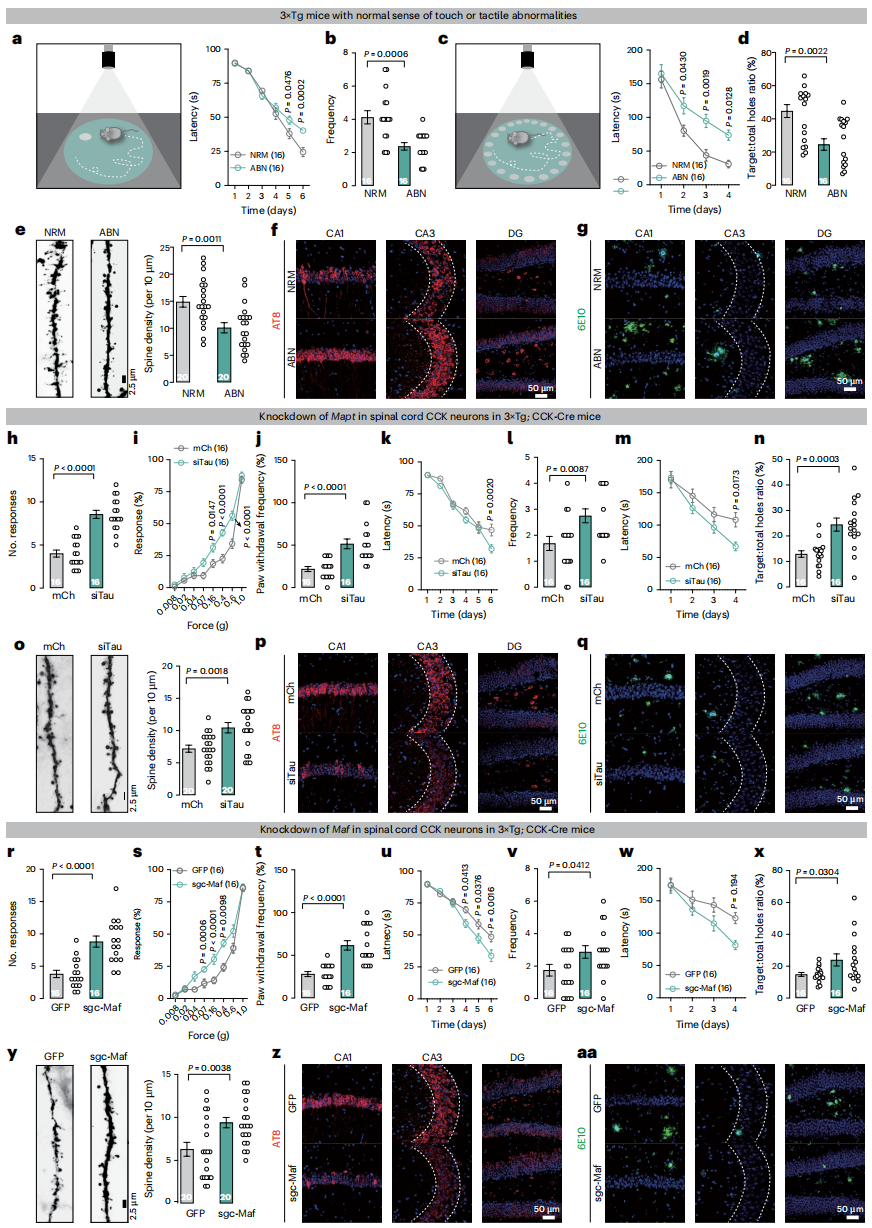为了验证早期干预触觉损伤的作用,将CCK-Cre与3×Tg小鼠杂交获得3×Tg;CCK-Cre小鼠,3月龄时向脊髓CCK神经元注射siTau病毒,结果显示其粘性胶带、Von Frey及动态触觉测试响应完全恢复(图7h-j),6月龄时莫里斯水迷宫和巴恩斯迷宫表现更优(图7k-n),12月龄时海马区树突棘密度升高、pTau强度降低、Aβ斑块减少(图7o-q)。感染c-Maf沉默病毒(sgc-Maf)的CCK-AD小鼠也呈现类似改善效果(图7r-aa)。构建更接近生理的模型,向3月龄Mapt(编码Tau蛋白的基因)敲除的CCK-Cre小鼠脊髓注射含人源野生型Tau(1N4R亚型,模拟Tau病理沉积)的AAV,2个月后出现触觉异常,3个月后出现学习记忆缺陷;相同模型过表达c-Maf也出现类似效应。综上,特异性沉默脊髓CCK神经元中的Tau或c-Maf干预触觉缺陷,可有效延缓AD进展。