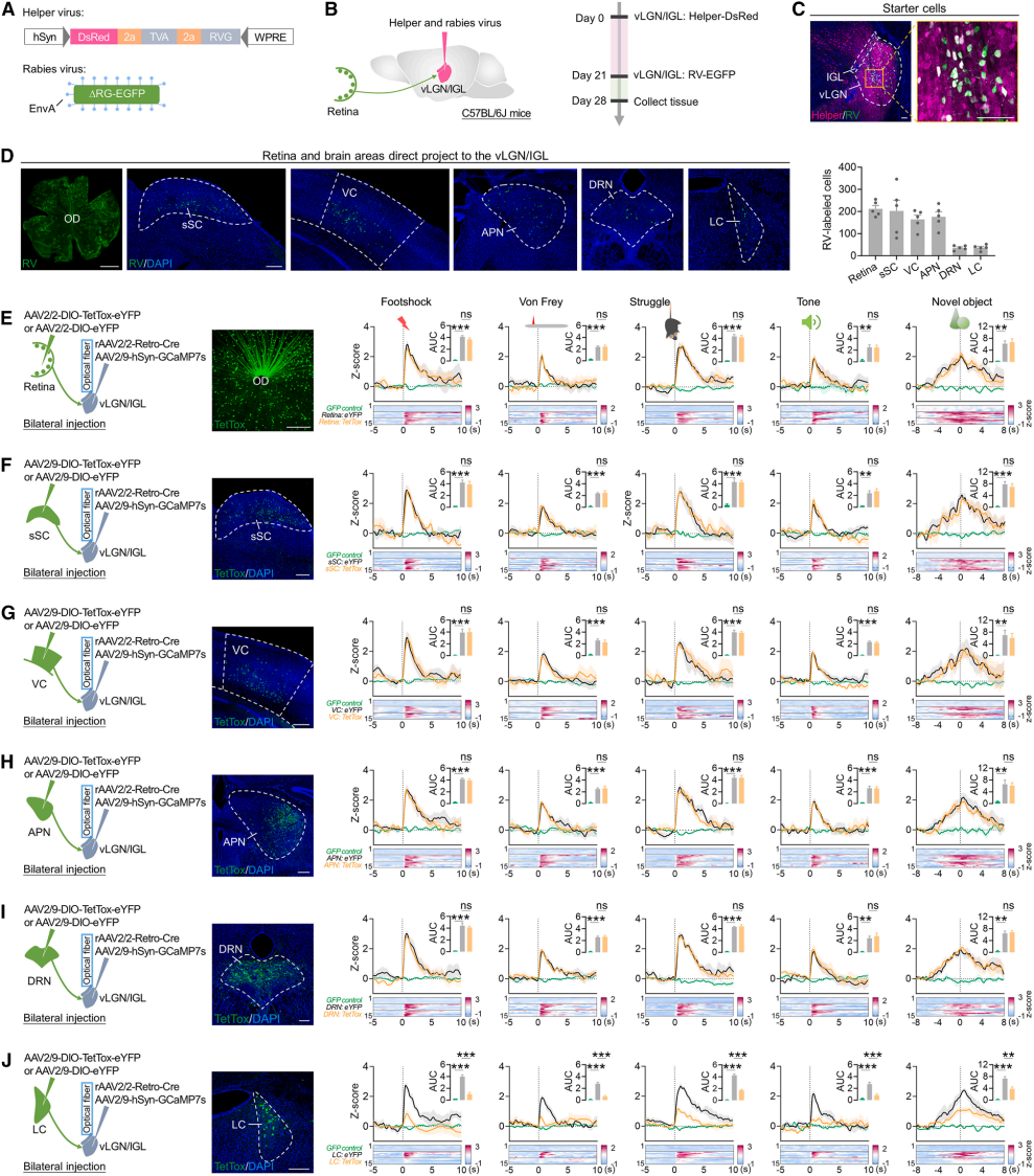 为了确定介导vLGN/IGL激活的通路,记录其神经元活动时选择性沉默各候选通路突触传递:向vLGN/IGL注射rAAV2/2-Retro-Cre,逆行标记视网膜、sSC、VC、APN、DRN或LC的投射神经元(图2E-J),再转染Cre依赖的TetTox病毒阻断突触释放(图2E-J);同时在vLGN/IGL表达GCaMP7s并植入光纤用于钙成像(图2E-J)。结果显示,沉默视网膜、sSC、VC、APN、DRN输入对vLGN/IGL响应无显著影响(图2E-I);而沉默LC-vLGN/IGL输入显著减弱该响应(图2J)。综上,LC输入对驱动vLGN/IGL被厌恶与中性新异刺激激活至关重要。