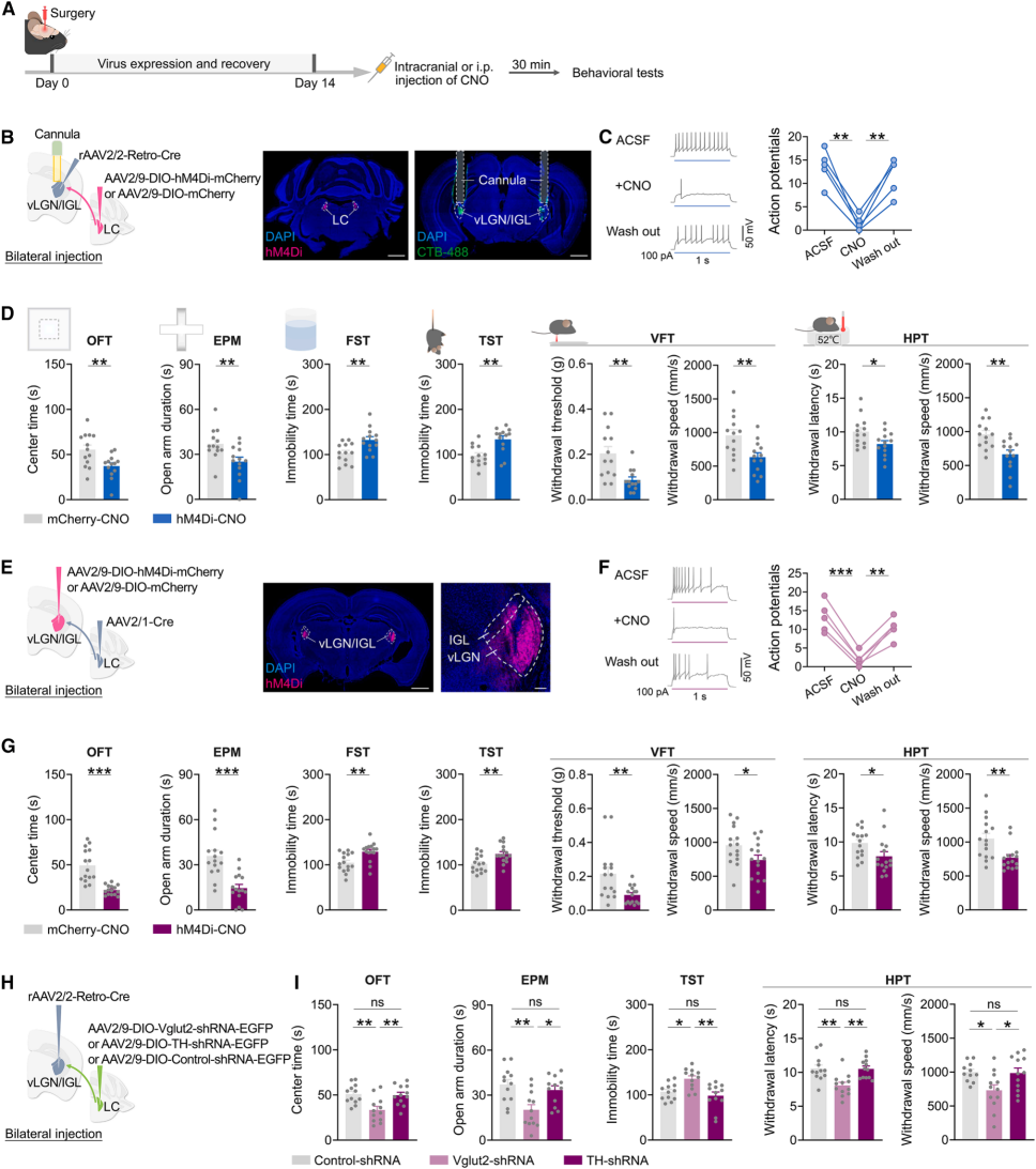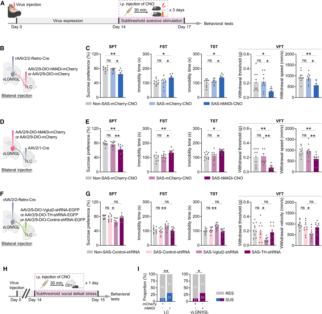 为了验证通路作用,向LC注射AAV2/1-Cre,向vLGN/IGL突触后神经元感染AAV2/9-DIO-hM4Di-mCherry(图4E-F),抑制接收LC直接输入的vLGN/IGL神经元(图4A),结果同样损害应激应对行为(图4G),证实LC-vLGN/IGL通路激活对促进应激应对策略是必需的。用shRNA敲低技术减少LC-vLGN/IGL神经元释放去甲肾上腺素或谷氨酸(图4H),发现野生型小鼠中,减少谷氨酸释放显著增加抑郁/焦虑样行为、降低疼痛阈值、减慢疼痛撤回速度(图4I),而减少去甲肾上腺素释放无显著影响(图4I),强调vLGN/IGL内谷氨酸释放对应激应对行为的关键介导作用。