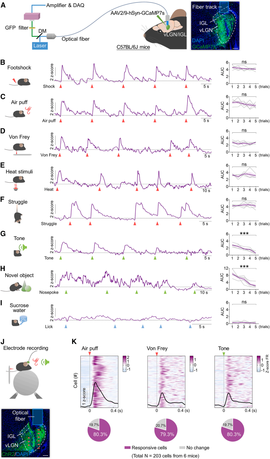 为了探究vLGN/IGL神经元对不同效价刺激的响应,向C57BL/6J小鼠vLGN/IGL注射编码GCaMP7s的AAV,通过光纤记录监测群体活动(图1A)。评估神经元对厌恶刺激的响应,发现足底电击、气流喷射、伤害性机械/热刺激均能强烈激活vLGN/IGL神经元(图1B-E);小鼠悬尾挣扎时,该神经元也显著激活,进一步证实其对厌恶环境的敏感性(图1F)。检测中性刺激响应时,中性听觉音调(75dB,500ms)首次刺激引发神经元显著兴奋,重复刺激后兴奋减弱(图1G);新物体探索中,小鼠靠近物体时vLGN/IGL神经元钙活动增强,随后逐渐下降(图1H),表明其对新异性刺激敏感。对比来看,小鼠摄取自然奖励(2%蔗糖水,20μL)时,vLGN/IGL活动无显著变化(图1I),凸显其对厌恶/中性新异刺激的选择性敏感。