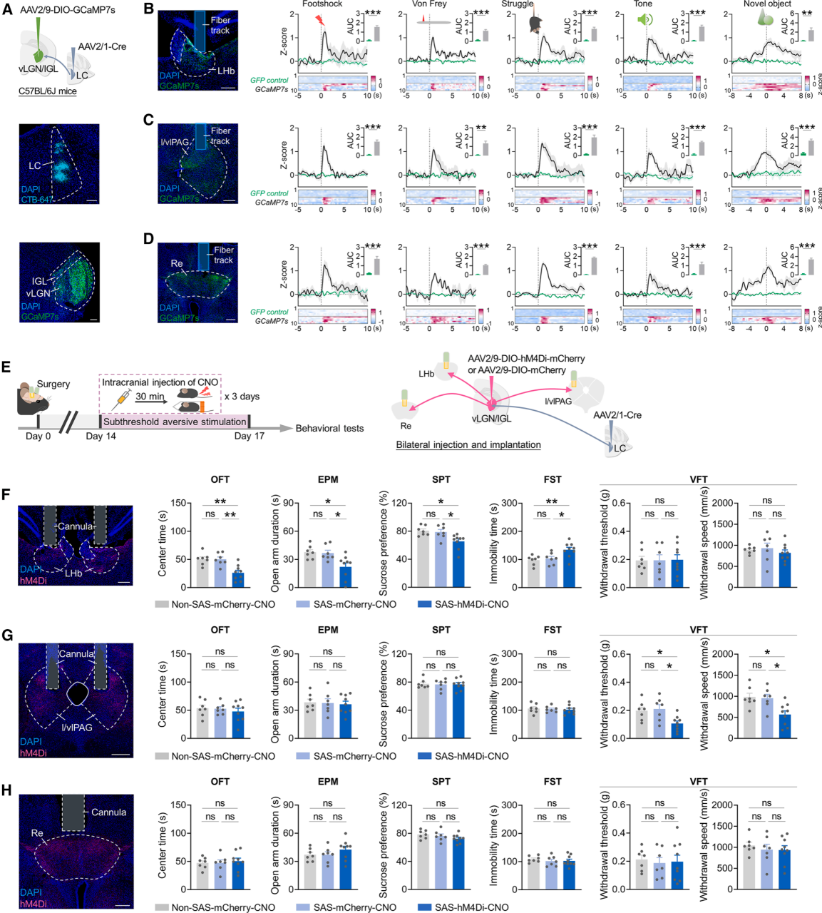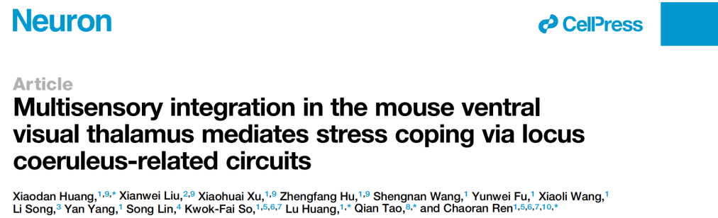 2025年11月5日,暨南大学任超然团队在Neuron上发表题为“Multisensory integration in the mouse ventral visual thalamus mediates stress coping via locus coeruleus-related circuits”相关文章,证实vLGN/IGL是整合多感官刺激的关键枢纽;该区域通过接收LC释放谷氨酸的兴奋性输入,对厌恶刺激(如足底电击)和中性新异刺激(如听觉音调)产生响应,进而介导应激应对行为;LC-vLGN/IGL通路通过向外侧缰核(LHb)、外侧/腹外侧导水管周围灰质(l/vlPAG)等下游脑区的差异化投射,分别调控情绪和疼痛相关行为。