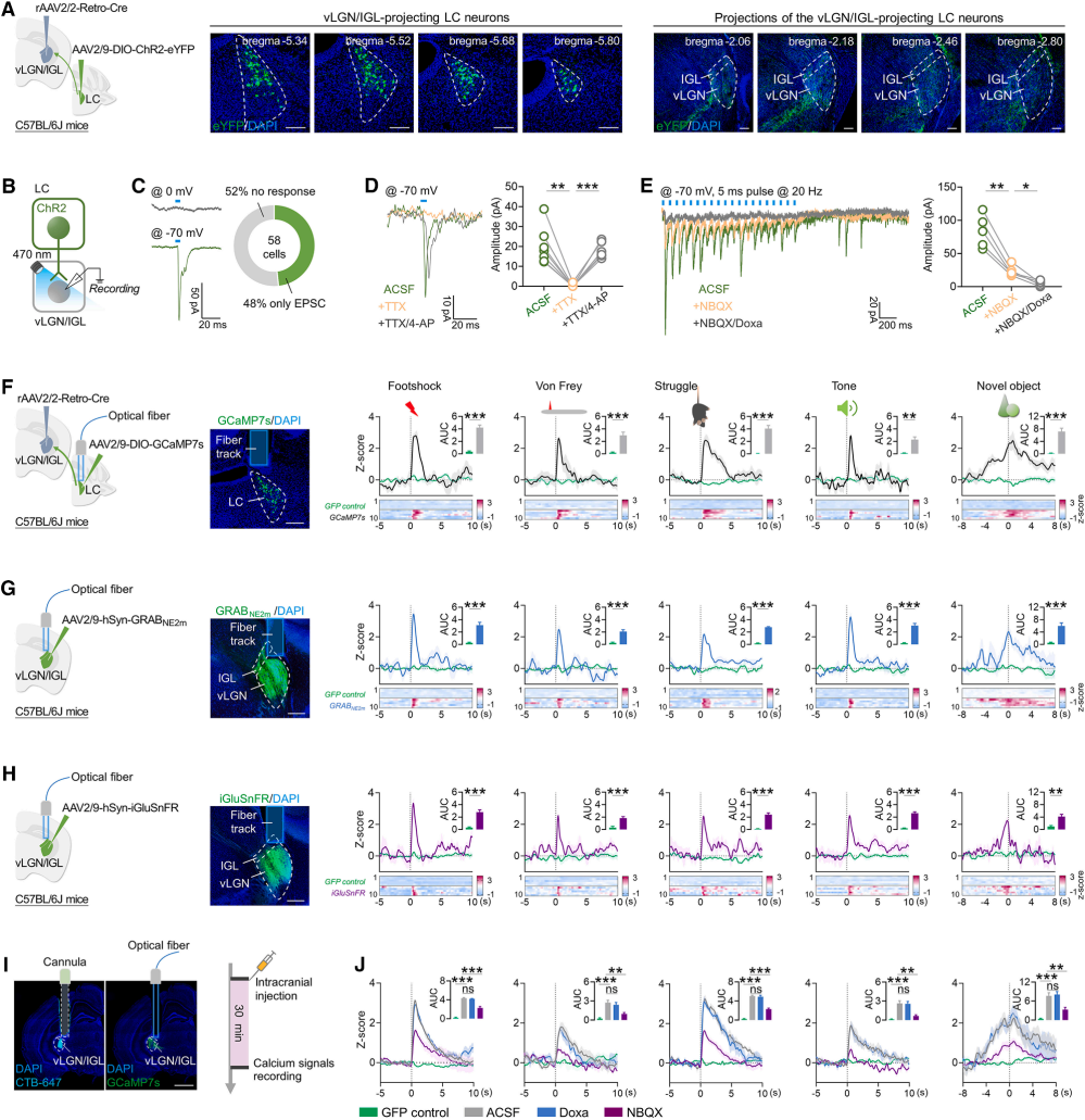 共标记实验显示,约64.2% eYFP标记的LC-vLGN/IGL神经元同时呈谷氨酸与TH阳性,证实部分LC神经元通过共释放两种递质直接支配vLGN/IGL。已有研究表明LC神经元对显著性刺激的响应特性,结合LC-vLGN/IGL激活的必要性(图2J)及兴奋性投射关系(图3D),研究人员假设该LC神经元可被厌恶/中性新异刺激激活。光纤光度法检测显示,两种刺激均能增强其钙活动(图3F),验证假设。综上,投射至vLGN/IGL的LC神经元同样可被厌恶刺激和中性新异刺激激活。进一步探究递质作用,利用基因编码的GPCR激活型去甲肾上腺素荧光探针(GRAB-NE)和谷氨酸荧光探针(iGluSnFR)监测发现,厌恶/中性新异刺激两种刺激均使vLGN/IGL中去甲肾上腺素与谷氨酸水平升高(图3G-H)。颅内注射Doxa对vLGN/IGL神经元活性无显著影响,而注射NBQX显著抑制其激活(图3I-J),表明谷氨酸是驱动该神经元响应的关键递质。