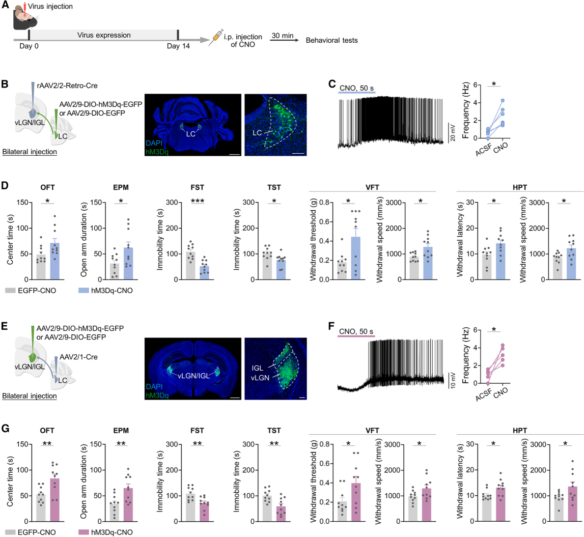基于此前抑制LC-vLGN/IGL通路损害应激应对、增加应激易感性的发现(图4、图5),研究人员探究激活该通路能否增强应激应对行为。首先,向vLGN/IGL注射rAAV2/2-Retro-Cre,向LC注射编码hM3Dq的AAV,靶向调控LC-vLGN/IGL神经元(图7A-B)。病毒表达2周后,行为测试前30分钟腹腔注射CNO激活神经元(图7C),结果显示OFT中心时间↑、EPM开臂探索↑、FST/TST不动时间↓、VFT机械阈值↑、HPT热撤回潜伏期↑、疼痛刺激退缩速度↑(图7D)。为了明确通路作用,向LC注射AAV2/1-Cre,向vLGN/IGL注射AAV2/9-DIO-hM3Dq-EGFP,激活vLGN/IGL突触后神经元(图7A、7E),同样促进应激应对行为(图7F-G)。此外,经历4周慢性厌恶应激的小鼠中,激活LC-vLGN/IGL神经元或其直接支配的vLGN/IGL神经元,均显著缓解慢性应激诱导的抑郁样症状。综上,激活LC-vLGN/IGL通路足以在多个行为域促进小鼠应激应对行为。