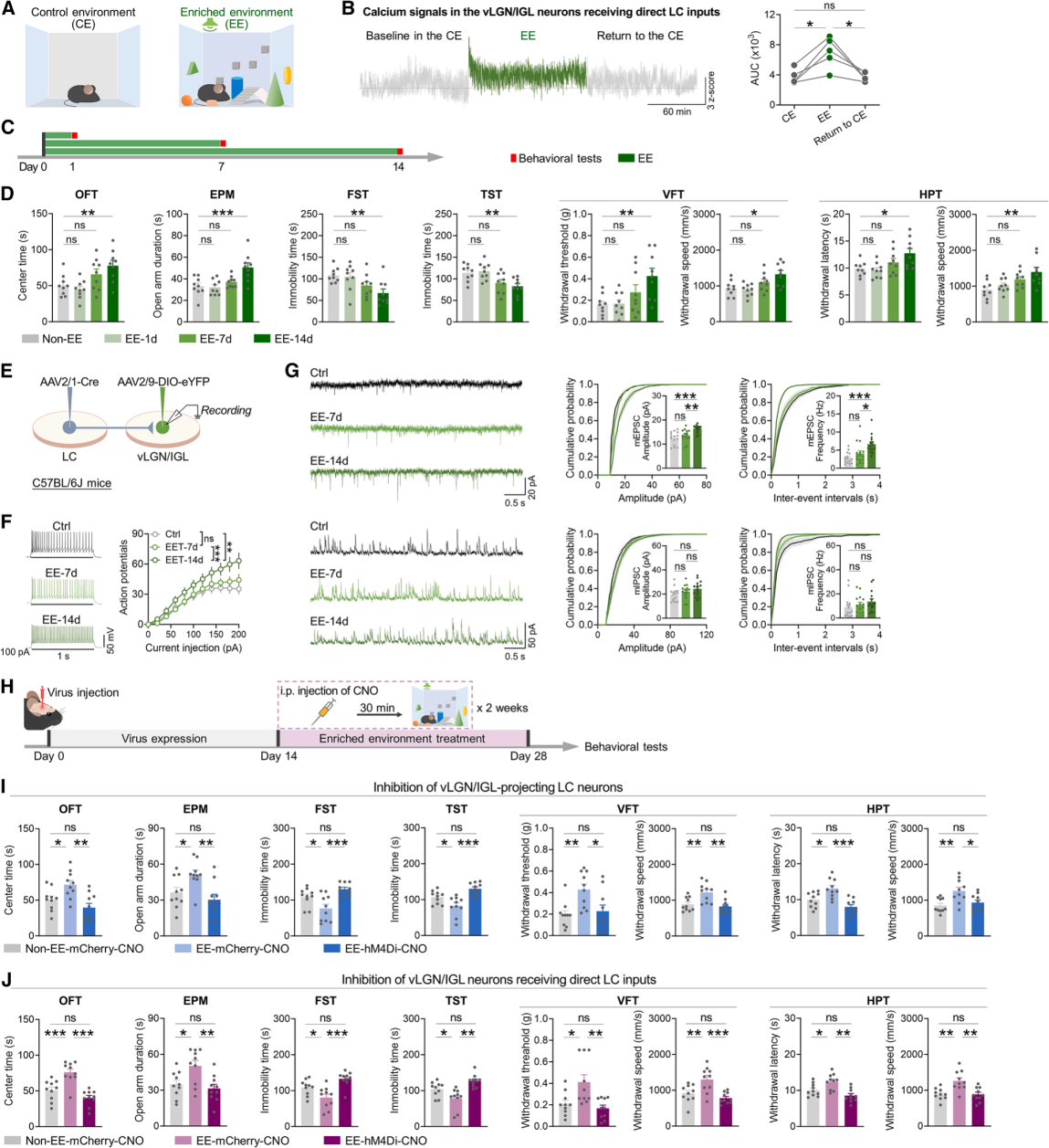 鉴于中性新异刺激可激活vLGN/IGL及LC-vLGN/IGL神经元(图1G、1H、1K、3F),且LC-vLGN/IGL通路激活能促进应激应对行为(图7),研究人员探究含该类刺激的环境富集(EE)处理是否增强小鼠应激应对行为(图8A)。为了评估EE处理对应激应对行为的影响,暴露2小时EE环境的小鼠,其接收LC直接输入的vLGN/IGL神经元活性显著增强(图8B);小鼠接受每日2小时、持续1天/1周/2周的EE处理(图8C),结果显示EE处理对小鼠应激应对行为的改善效果,和处理的持续时间正相关(图8D)。且2周EE处理后,该类vLGN/IGL神经元电流诱发动作电位增加,mEPSC频率与振幅升高(图8E-8G),提示长期EE可促进应激应对行为,伴随vLGN/IGL神经元兴奋性增强。EE处理期间化学遗传学抑制LC-vLGN/IGL神经元(图8H),EE诱导的应激应对增强效应消失(图8I);抑制接收LC直接输入的vLGN/IGL神经元(图8H),应激应对改善效果显著减弱(图8J),综上表明LC-vLGN/IGL通路是EE促进应激应对行为的关键介导通路。