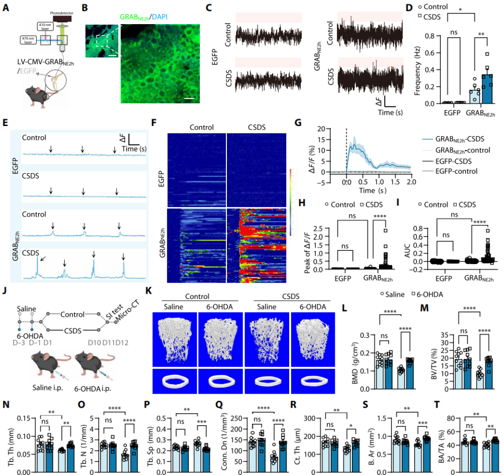 尽管流行病学和临床前研究已证实骨质疏松症与交感神经过度激活相关,但骨内去甲肾上腺素能动态的实时监测技术一直受限。采用基因编码G蛋白偶联受体(GPCR)激活型NE传感器(LV-CMV-GRABNE2h)监测骨内交感神经活性(图2A-B)。结果显示,CSDS小鼠骨内交感神经自发活性显著高于对照组,慢病毒(LV-CMV-EGFP)对照组几乎无荧光信号(图2C-D)。施加伤害性刺激后,CSDS小鼠骨内其交感神经活性更高(图2E-I)。为了验证交感神经过度激活对CSDS小鼠骨量的负面影响,每隔一天腹腔注射6-OHDA进行化学交感神经切除(图2J)。TH免疫标记三维成像证实,6-OHDA处理组TH⁺神经纤维几乎完全消融。micro-CT分析表明,6-OHDA处理可预防CSDS诱导的骨损伤,维持松质骨微观结构、皮质骨厚度及骨体积(图2K-T)。此外,区域交感神经切除小鼠对CSDS诱导的骨丢失具有抵抗力。综上,CSDS通过过度激活交感神经系统(SNS)破坏骨代谢平衡。