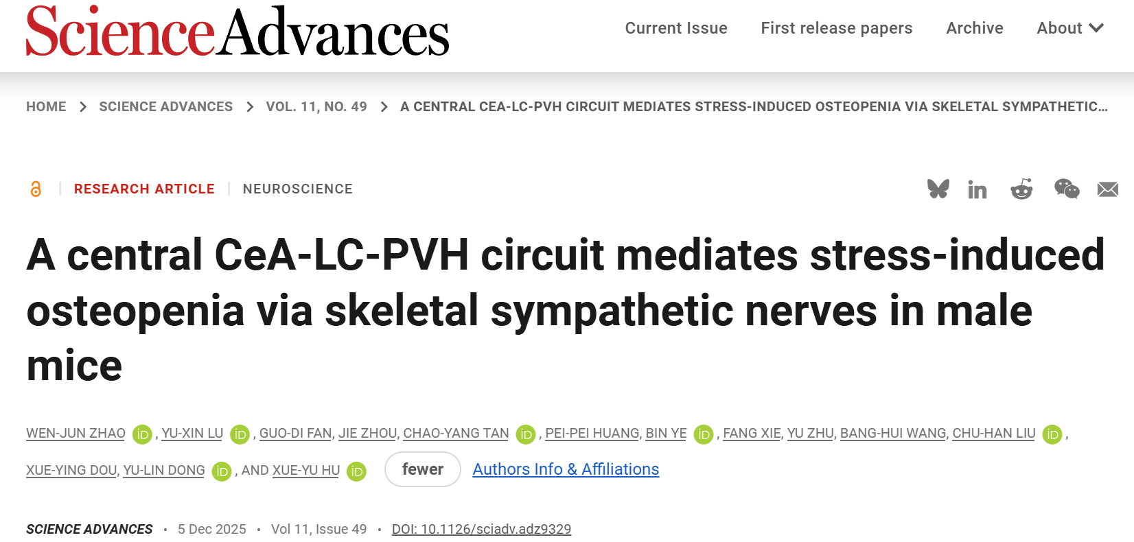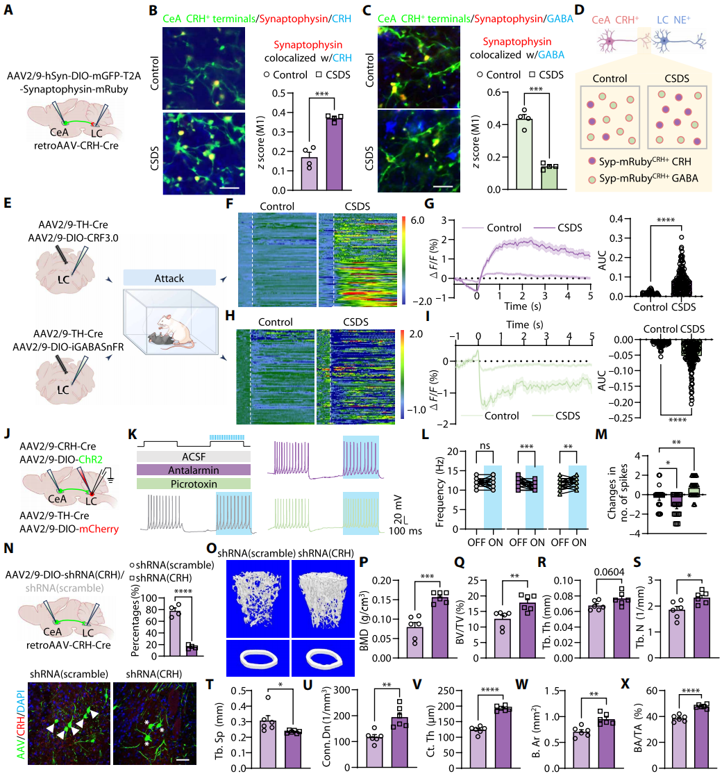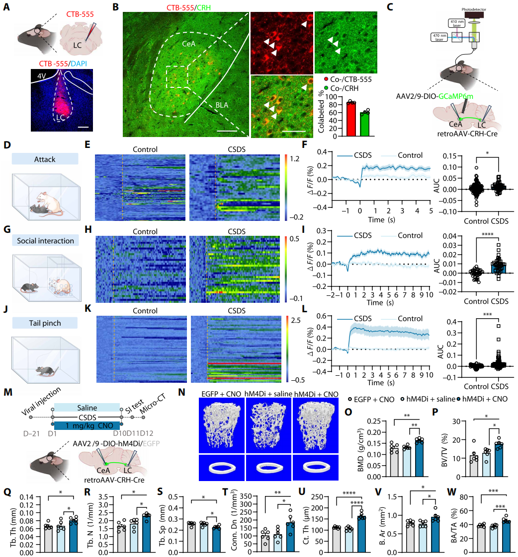 2025年12月5日,空军军医大学胡学昱和董玉琳共同通讯在Science Advances上发表题为“A central CeA-LC-PVH circuit mediates stress-induced osteopenia via skeletal sympathetic nerves in male mice”相关研究,揭示了慢性社交挫败压力(CSDS)诱导雄性小鼠骨丢失的核心机制,通过激活CeACRH+-LCNE+-PVHCRH+神经通路,引发CeACRH+神经元向LCNE+神经元的CRH释放增强、GABA能传递抑制的双向失衡,经交感神经传导至骨骼,导致破骨细胞数量增加、骨微结构破坏;而靶向抑制该通路、恢复CRH/GABA平衡或阻断交感神经激活,可有效缓解压力相关性骨质疏松。