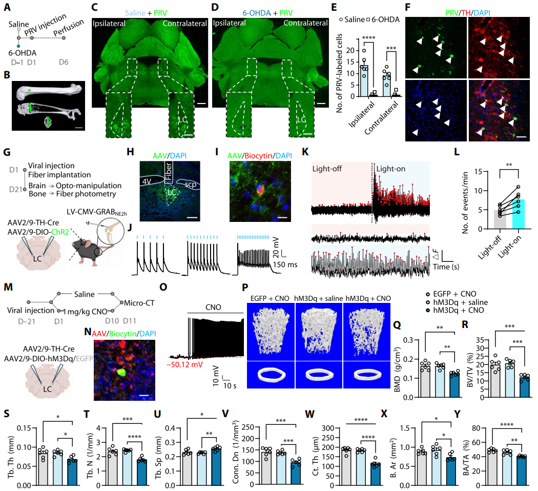 为了探究选择性激活蓝斑去甲肾上腺素能(LCNE+)神经元对骨内交感神经兴奋性的影响,向双侧LC注射rAAV-DIO-ChR2-EGFP及rAAV-TH-CRE;同时向股骨骨髓腔注射LV-CMV-GRABNE2h(图3G-H)。经5/10/20Hz 473nm激光电生理验证病毒有效性后(图3I-J),发现470nm波长下GRABNE2h荧光信号频率显著升高(图3K-L)。为了明确激活LCNE+神经元对骨量的影响,采用化学遗传学方法:向双侧LC共注射rAAV-Ef1a-DIO-hM3D(Gq)与rAAV-TH-CRE(图3M-O)。病毒表达3周后,小鼠连续10天腹腔注射CNO或生理盐水,结果显示特异性激活LCᴺᴱ⁺神经元导致小鼠松质骨微观结构破坏、皮质骨厚度及股骨体积减少(图3P-Y)。上述结果表明,LCNE+神经元通过神经环路支配骨内交感神经,其特异性激活可引发小鼠骨量下降。