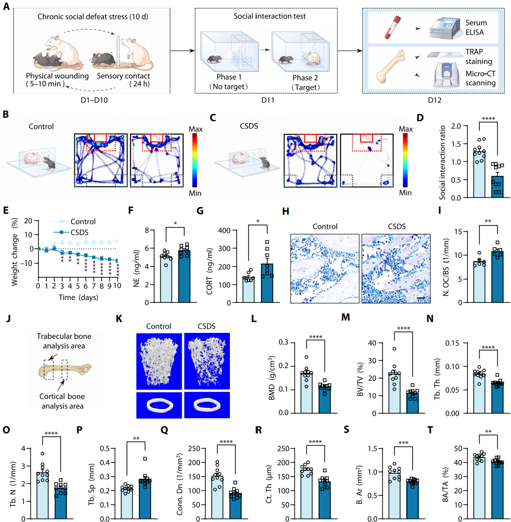 为了探究慢性压力对骨代谢的病理生理影响,建立CSDS模型模拟人类慢性社会心理压力(图1A)。小鼠经10天CSDS暴露后,行为学评估显示其出现明显社交回避,社交互动区域活动时间占比显著低于对照组(图1B-D)。干预期间体重持续下降(图1E),去甲肾上腺素(NE)及血清皮质酮水平显著升高(图1F-G)。抗酒石酸酸性磷酸酶染色显示,CSDS小鼠股骨破骨细胞数量(N.OC/BS)显著增加(图1H-I)。显微计算机断层扫描(micro-CT)定量分析表明,小鼠股骨松质骨与皮质骨均出现严重骨结构损伤(图1J-K)。松质骨三维微观结构分析显示,CSDS显著降低骨矿物质密度(g/cm³)、松质骨体积分数(BV/TV)、骨小梁厚度(Tb.Th)、骨小梁数量(Tb.N)及连接密度(Conn.Dn,1/mm³),同时增加骨小梁间距(Tb.Sp)(图1L-Q)。此外,皮质骨定量分析显示,CSDS小鼠的皮质骨厚度(Ct.Th)、皮质骨面积(B.Ar)及皮质骨面积占比(BA/TA)均较对照组显著降低(图1R-T)。