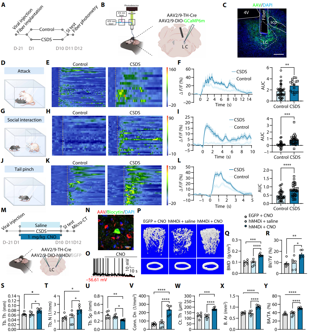 为了在体探究压力暴露期间LCNE+神经元活性,向LC注射Cre依赖型rAAV-Ef1a-DIO-GCaMp6m与rAAV-TH-NLS-CRE病毒(图4A-C)。对CSDS组与对照组小鼠,在三种压力条件下记录:遭遇CD-1攻击性小鼠攻击、社交互动或疼痛夹尾刺激。结果显示,CSDS组小鼠在这些刺激下的群体钙信号显著强于对照组且钙瞬变显著增加(图4F-L),证实CSDS小鼠LCNE+神经元兴奋性升高。基于上述发现,推测特异性抑制该神经元可增加CSDS小鼠骨量。为了验证假设,向双侧LC注射rAAV-Ef1a-DIO-hM4D(Gi)与rAAV-TH-CRE病毒(图4M-O)。CSDS组小鼠连续10天遭遇攻击性小鼠前1小时,腹腔注射CNO抑制LCNE+神经元。micro-CT结果证实与对照组相比,特异性抑制LCNE+神经元可显著缓解CSDS小鼠骨丢失(图4P-Y)。综上,降低LCᴺᴱ⁺神经元兴奋性可缓解CSDS诱导的骨丢失。