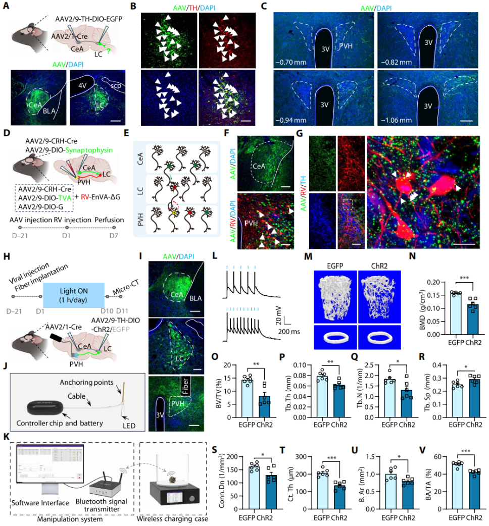慢性压力通过CeACRH+-LCNE+-PVHCRH+神经通路,经交感神经介导骨丢失,其关键机制是CeA-LC环路的CRH/GABA传递失衡;首次明确中枢神经环路调控压力性骨丢失的分子机制,确立 LCᴺᴱ⁺神经元为压力响应核心枢纽;为压力相关性骨质疏松提供神经通路导向的治疗策略。