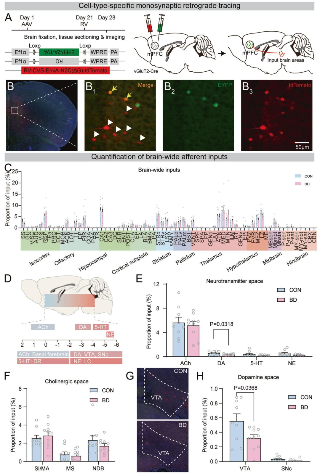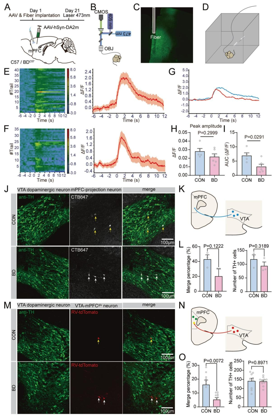 已证实BD组小鼠的mPFC神经元存在多巴胺结构和功能缺陷。为验证BD组小鼠VTA多巴胺能神经元向mPFC谷氨酸能神经元的投射变化,研究通过mPFC注射逆行示踪剂CTB追踪VTA投射神经元并免疫染色鉴定其多巴胺能属性,发现BD组投射至mPFC的VTA多巴胺能神经元数量呈下降趋势(图5J-L);进一步通过结合狂犬病毒跨单突触追踪与TH免疫染色,研究直接观察到与mPFC谷氨酸能神经元形成突触连接的VTA多巴胺能神经元数量在BD小鼠中显著减少(图5M-O)这些结果从细胞连接层面证实,BD小鼠存在VTA多巴胺能神经元向mPFC谷氨酸能神经元的特异性突触投射损伤,为前述结构与功能的多巴胺异常提供了直接的解剖学证据。
