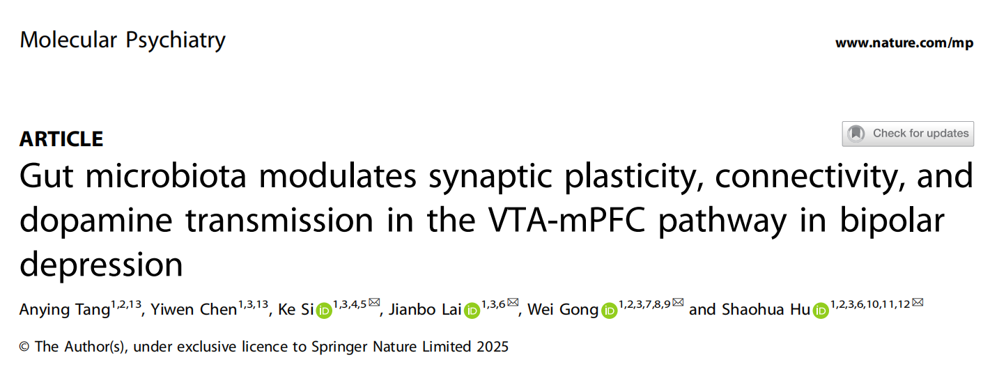 近期,浙江大学医学院附属第一医院精神卫生中心胡少华教授、来建波特聘研究员,联合浙江大学脑科学与脑医学学院,浙江大学极端光学技术与仪器全国重点实验室及良渚实验室龚薇教授、斯科教授团队在Molecular Psychiatry杂志上发表了题为“Gut microbiota modulates synaptic plasticity, connectivity, and dopamine transmission in the VTA-mPFC pathway in bipolar depression”的研究文章。该研究揭示了BD患者肠道菌群通过削弱VTA-mPFC多巴胺能通路的结构连接与功能响应,损害mPFC突触可塑性,进而诱发抑郁样行为,为理解BD的肠-脑轴机制提供了新的实验依据。