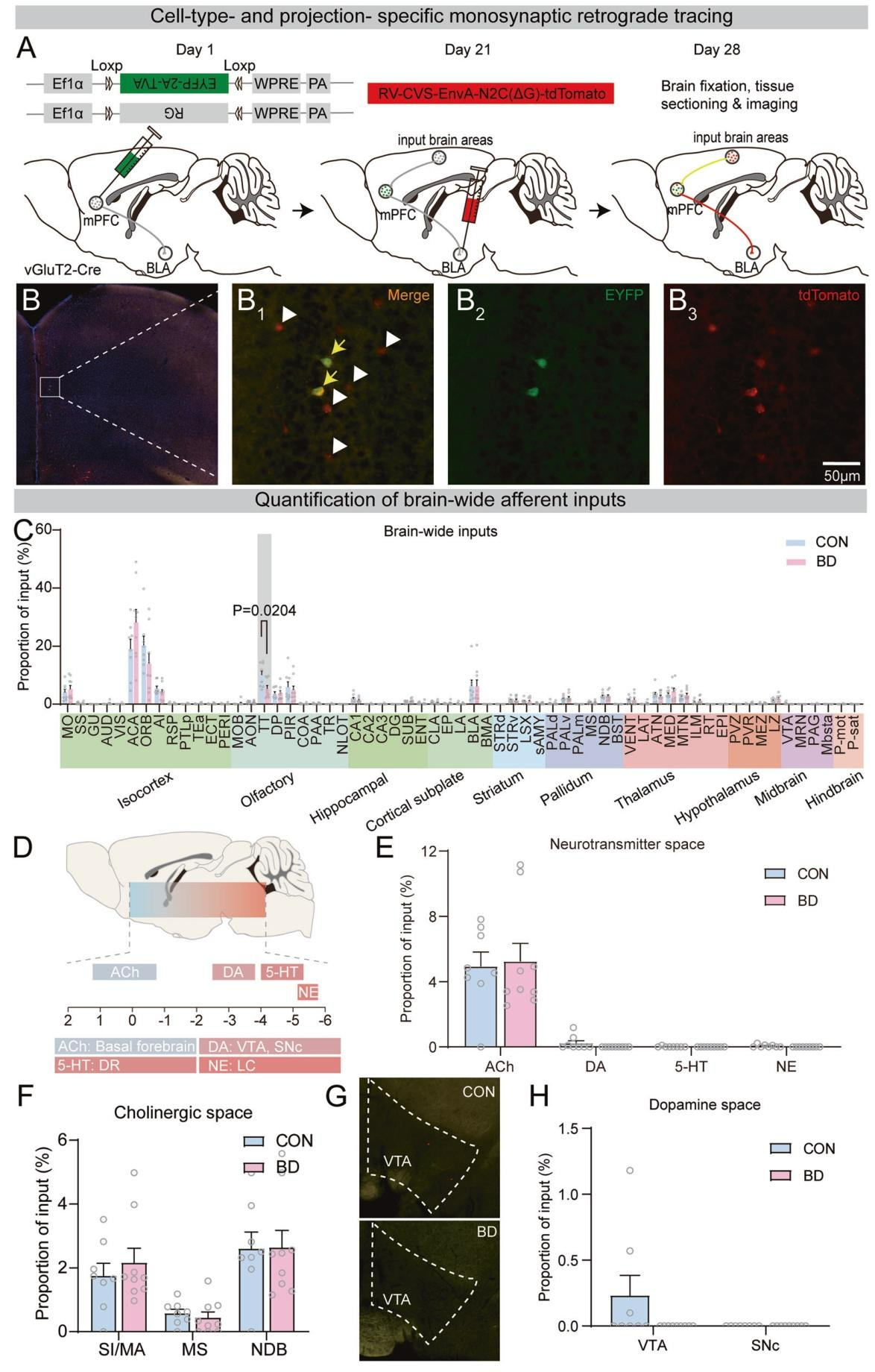 鉴于BLA是与双相情感障碍(BD)高度相关的脑区,且mPFC向杏仁核基底外侧核发出密集投射。为探究肠道微生物群移植对BD小鼠投射至BLA的mPFC谷氨酸能神经元神经连接的影响,采用病毒跨突触追踪策略。先向mPFC注射AAV helper混合载体(AAV-EF1α-DIO-EGFP-T2A-TVA和AAV-EF1α-DIO-G),3周后向BLA靶向注射狂犬病病毒(RV-CVS-EnvA-N2C(ΔG)-tdTomato。),经1周表达后对全脑单突触传入进行成像(图4A)。验证结果显示,起始细胞集中于mPFC前边缘-边缘下复合体,约70%集中在Ⅱ/Ⅲ层,两组起始细胞密度无差异(图4B)。全脑组织成像发现,BD组小鼠来自顶盖带(TT)和VTA的输入显著减少和缺失(图4C);进一步分析乙酰胆碱、多巴胺等神经递质系统及丘脑、海马等脑区的输入,显示两组小鼠的输入模式均无显著差异(图4D-H)。综上,BD小鼠投射至BLA的mPFC神经元传入输入重塑具有区域特异性,核心特征为TT和VTA输入缺失。