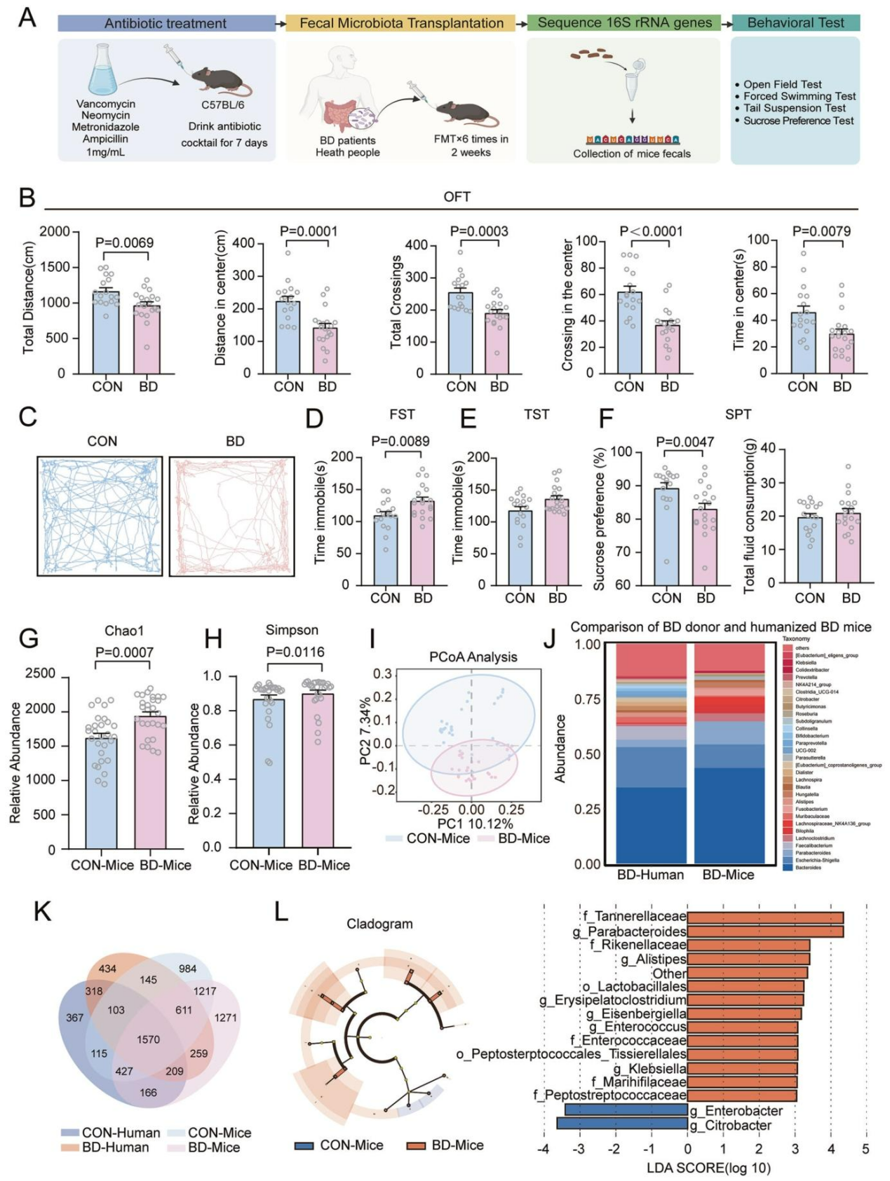 研究首先通过抗生素处理(ABX)有效清除了受体小鼠的内源性菌群,随后对小鼠进行了双相障碍患者或健康供体的FMT。16S rRNA 测序显示,两组小鼠肠道菌群结构差异显著:α 多样性分析中 ,BD 组 Chao1、Simpson 指数更高(图1G-H),Shannon 指数和物种丰富度无差异;PCoA 分析表明两组菌群群落明显分离(图1I);LEfSe 分析发现 BD 组富集 6 种炎症相关菌属,部分有益菌属(如柠檬酸杆菌属、肠杆菌属)相对减少(图1L)。进一步分析表明,BD小鼠的菌群特征与人类BD患者的菌群高度重叠,共 259 个细菌物种(图1J、K)。综上,FMT有效构建了具有BD患者菌群特征的小鼠模型。