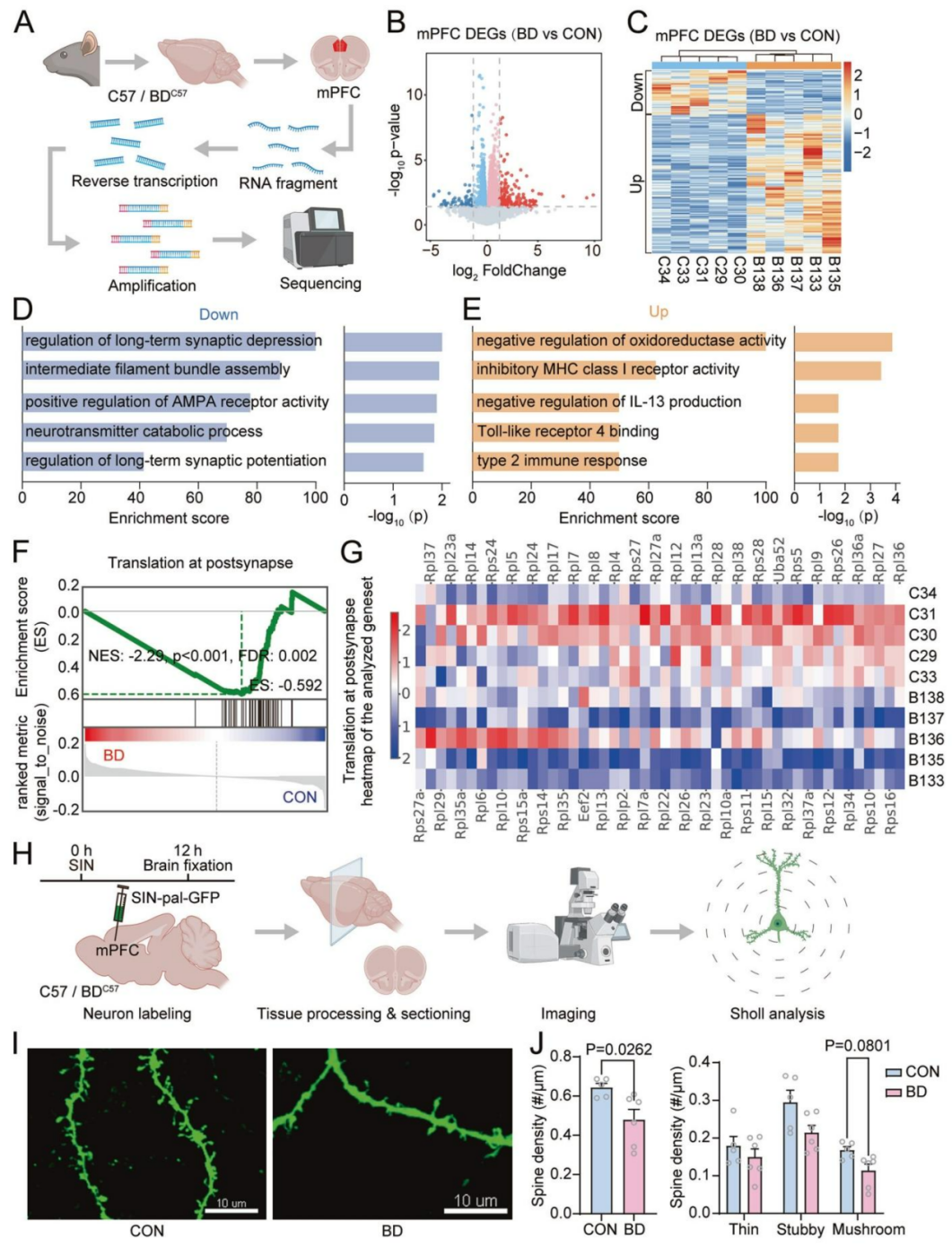为探究微生物-肠-脑轴如何调控双相抑郁样行为,研究聚焦于情绪调节关键脑区——mPFC。RNA测序显示,BD小鼠mPFC中存在202个基因上调和64个基因下调,且两组样本聚类明显分离(图2A-C)。GO富集显示下调基因主要与树突棘可塑性相关,而上调基因主要参与免疫反应(图2D-E)。通过GSEA进一步确认,“突触后翻译”是下调最显著的生物学过程,该过程调控长期突触可塑性(图2FG),同时qPCR实验验证了参与“突触后翻译”的Rpl、Rps、Eef、Uba等相关基因表达降低,这表明移植的微生物群损害了mPFC的长期突触可塑性。