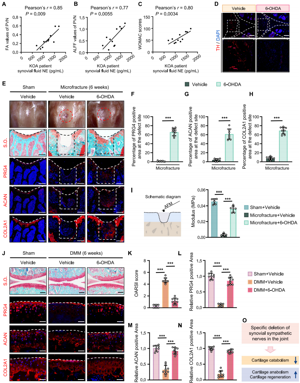 现有数据表明激活PVN或PVNCRH神经元会增加关节交感神经NE释放。研究人员进一步通过临床研究,检测KOA患者滑膜液NE浓度,发现其与PVN的FA值、ALFF值及WOMAC评分均呈正相关(图3A-C),提示关节滑液的NE浓度升高与患者PVN神经活动增强、软骨损伤加重密切相关。为了验证关节交感神经与软骨再生的调控关系,研究人员通过关节内注射6-羟基多巴胺(6-OHDA)建立了消融关节交感神经模型(图3D)。研究结果表明消融滑膜交感神经可促进稳定成熟软骨形成(图3E,F),增强软骨合成代谢(图3G,H)及弹性模量(图5I),抑制纤维软骨形成和分解代谢。DMM模型中,该操作可减轻软骨结构损伤(图3J,K),上调PRG4、ACAN、COL2A1表达(图3L-N),下调COL1A1、MMP13表达,同时缓解OA相关疼痛。