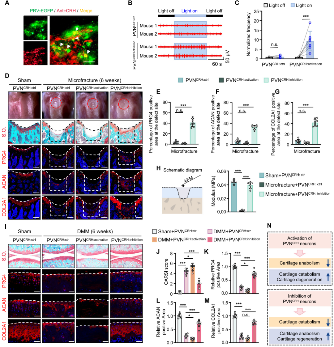 PVNCRH神经元是调控焦虑抑郁的关键神经元类型,推测其活动可通过滑膜神经传出信号调控软骨再生。研究人员进一步通过免疫荧光染色证实了PVNCRH神经元和关节之间存在连接(图2A)。为了验证PVNCRH神经元与滑膜神经的环路,光遗传学激活小鼠PVNCRH神经元并记录滑膜神经电活动。结果显示,激活PVNCRH神经元可即刻诱导滑膜神经电活动增加(图2B,C),证实二者存在功能性连接。为了明确PVNCRH神经元对软骨再生的调控作用,对CRH-Cre小鼠PVN区注射不同AAV载体,再进行软骨缺损或DMM手术(内侧半月板失稳手术,常用骨关节炎动物模型构建方法)构建软骨损伤模型。结果表明,抑制PVNCRH神经元可显著改善软骨再生及OA评分(图2D,I,J),上调PRG4、ACAN、COL2A1表达(软骨合成代谢标志物,图2E-G,K-M),下调COL1A1和MMP13表达(纤维软骨/软骨分解代谢标志物),恢复软骨弹性模量至接近正常水平(图2H),并缓解疼痛。反之,激活PVNCRH神经元会诱导软骨退变(图2I,J),伴随合成标志物下调、分解标志物上调(图2K,L)。综上,进一步证实了PVN中特定神经元(PVNCRH神经元)对关节软骨再生具有重要调控作用(图2N)。