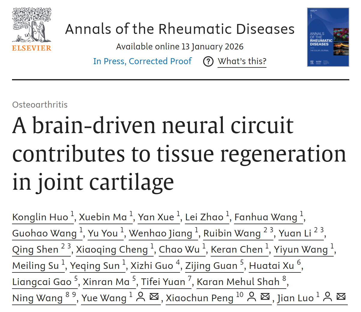 2026年1月13日,同济大学医学院附属养志康复医院(上海市阳光康复中心)罗剑教授团队,在Annals of the Rheumatic Diseases在线发表了题为“A brain-driven neural circuit contributes to tissue regeneration in joint cartilage”相关文章,首次证实存在下丘脑室旁核促肾上腺皮质激素释放激素神经元(PVNCRH)-关节滑膜交感神经组成的脑-软骨神经环路,通过去甲肾上腺素(NE)/β2-肾上腺素能受体(ADRB2)/PRG4⁺细胞通路调控软骨再生,且新生软骨的形态结构、分子标志物表达及力学性能均与天然透明软骨高度一致。