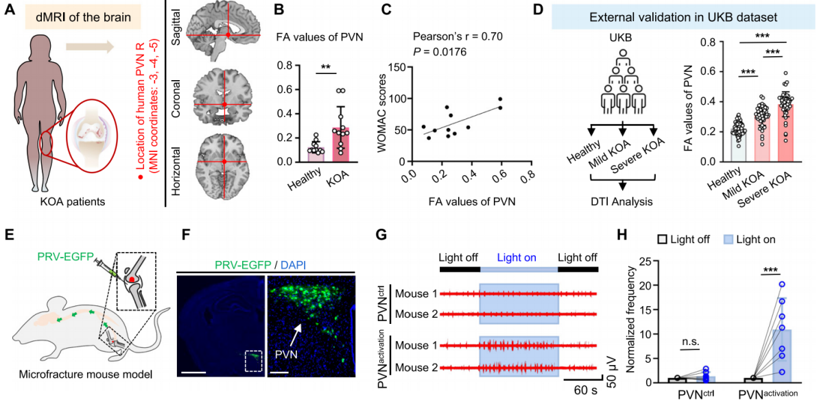 研究人员利用脑部磁共振成像,发现膝骨关节炎(KOA)患者PVN的部分各向异性(FA,扩散张量成像常用指标,反映脑白质纤维完整性)和低频波动振幅(ALFF,低频波动振幅,静息态功能磁共振指标,反映脑区自发神经活动强度)值升高,且与其软骨损伤呈正相关(图1A,B,C)。此外,利用英国生物样本库(UKB)数据进行验证也得到了一致的结论(图1D)。上述结果表明PVN升高的FA、ALFF值或可作为OA发展的潜在生物标志物。