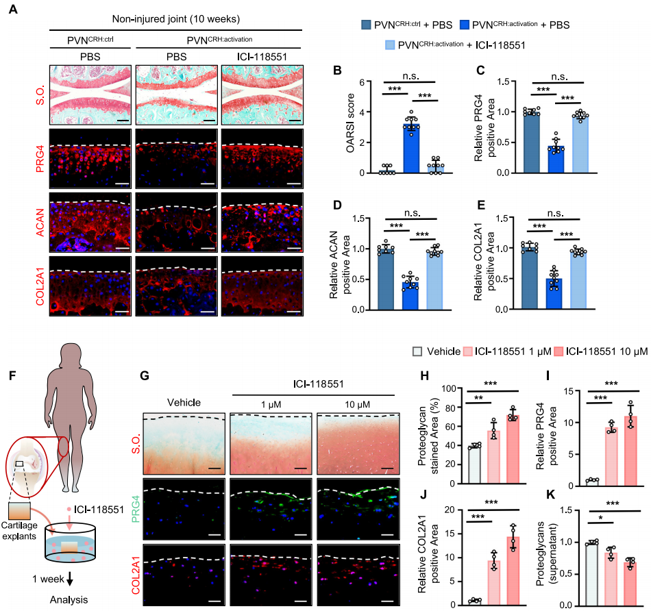 在非损伤关节小鼠模型中探究,关节内注射ADRB2特异性反向激动剂ICI-118551,能否挽救PVNCRH神经元激活引发的软骨退变。结果显示,ICI-118551干预6周即呈现有益效果,10周时保护作用显著(图5A-E),软骨指标近乎恢复正常生理水平,证实抑制ADRB2可有效预防PVNCRH神经元激活导致的软骨退变。