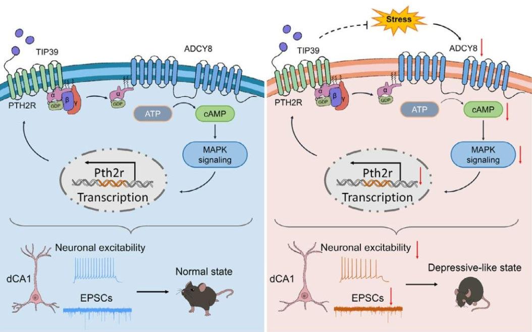 本研究阐明了一条全新的抑郁调控通路:dCA1神经元中Adcy8可通过调控细胞内钙信号、内在兴奋性及谷氨酸能神经传递,发挥抑制小鼠抑郁样行为的作用。相反,慢性应激选择性降低dCA1区兴奋性神经元中Adcy8的表达,其缺失通过抑制MAPK信号下调PTH2R水平,损害神经元兴奋性与谷氨酸能传递,最终诱发抑郁样行为;而干预下游PTH2R或其内源性配体TIP39可逆转相关缺陷,揭示了Adcy8-PTH2R信号轴在应激相关抑郁中的核心作用,为抑郁症提供了潜在治疗靶点。