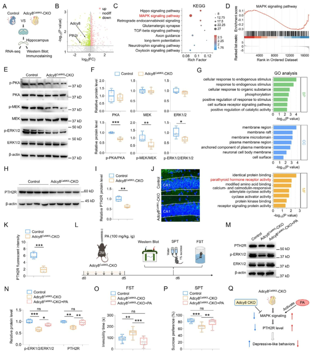 为深入探究Adcy8调控抑郁样行为与突触功能的分子机制,研究对Adcy8CaMKII-CKO小鼠海马组织进行RNA测序分析。结果显示,Adcy8敲除后海马基因表达谱发生显著改变,其中MAPK信号通路相关基因集显著下调(图6A-D)。蛋白水平验证进一步表明,Adcy8CaMKII-CKO小鼠海马中p-PKA、p-MEK、p-ERK1/2等MAPK通路关键蛋白磷酸化水平降低(图6E、F)。GO富集分析发现差异表达基因在甲状旁腺激素受体活性等方面显著富集;进一步筛选显示,甲状旁腺激素2受体(PTH2R)编码基因Pth2r在敲除小鼠中表达显著下降(图6G)。Westernblot及免疫染色证实Adcy8CaMKII-CKO小鼠海马PTH2R蛋白水平降低(图6H-K),这一变化与慢性应激小鼠中的表型一致。为验证MAPK信号下调是否介导PTH2R减少及行为表型,研究给予Adcy8CaMKII-CKO小鼠ERK1/2选择性激动剂PA干预后,小鼠海马p-ERK1/2及PTH2R蛋白水平均得以恢复(图6M、N),且抑郁样行为显著改善(图6O、P)。综上,Adcy8可能通过cAMP-MAPK信号轴调控PTH2R表达,进而影响抑郁样行为,PTH2R是该通路中关键的下游效应分子(图6Q)。