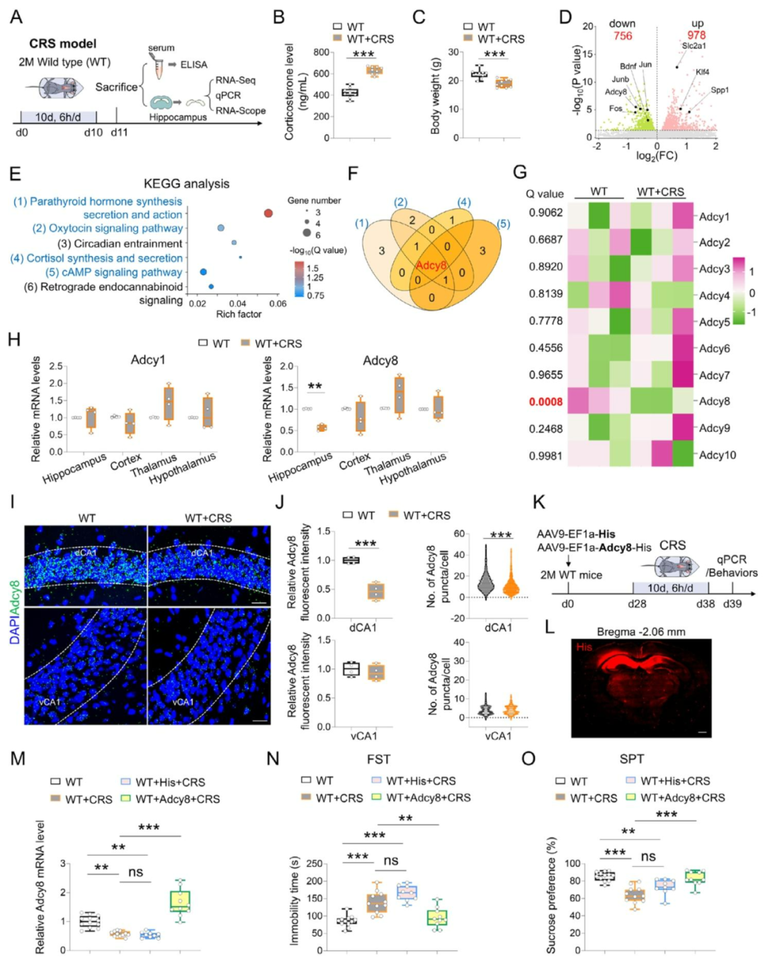 图1 CRS选择性降低海马体中Adcy8的表达,且上调Adcy8表达可逆转CRS小鼠的抑郁样行为。