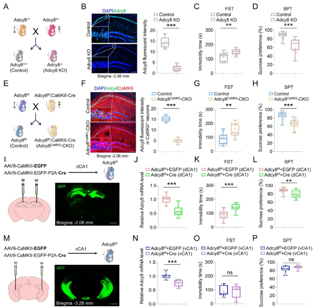 为明确Adcy8缺陷与小鼠神经精神疾病的关联,构建全身Adcy8敲除(KO)小鼠(图3A),海马RNA-scope证实KO小鼠Adcy8 mRNA几乎缺失(图3B);且KO小鼠FST不动时间延长、SPT偏好率降低(图3C、D),提示Adcy8调控抑郁样及焦虑样行为。为明确组织/细胞特异性功能,构建Adcy8CaMKII-CKO(兴奋性神经元敲除)和Adcy8PV-CKO(抑制性神经元敲除)小鼠(图3E),RNA-scope验证Adcy8CaMKII-CKO小鼠dCA1神经元Adcy8 mRNA缺失(图3F);行为学显示其仅FST、SPT呈抑郁样行为(图3G、H),而Adcy8PV-CKO小鼠无显著差异,表明Adcy8通过CaMKII-Cre⁺兴奋性神经元调控抑郁样行为。进一步向Adcy8f/f小鼠dCA1注射CaMKII-Cre病毒(图3I),证实dCA1敲除Adcy8可降低mRNA水平(图3J)并重现抑郁样行为(图3K、L),而vCA1敲除无此效应(图3M-P),最终证实dCA1兴奋性神经元中Adcy8敲除致小鼠抑郁样行为。