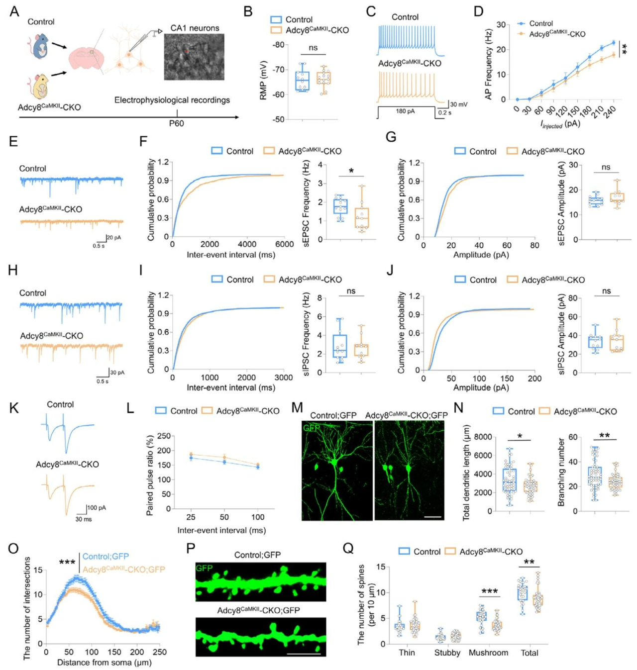 将Adcy8f/f;Thy1-GFP小鼠与Adcy8CaMKII-CKO小鼠杂交,构建对照;GFP小鼠和Adcy8CaMKII-CKO;GFP小鼠,借助Thy1启动子驱动GFP信号标记兴奋性神经元。结合神经元形态特征分析,Adcy8敲除导致dCA1神经元树突总长度、分支数量及复杂性显著降低,成熟树突棘数量减少,(尤其是作为突触后位点的蘑菇状成熟棘突)(图5M-Q)。这些结果表明,综上,Adcy8缺失可损害dCA1神经元的电生理兴奋性、谷氨酸能突触传递及树突形态,从多维度揭示了其调控神经元功能的具体机制。