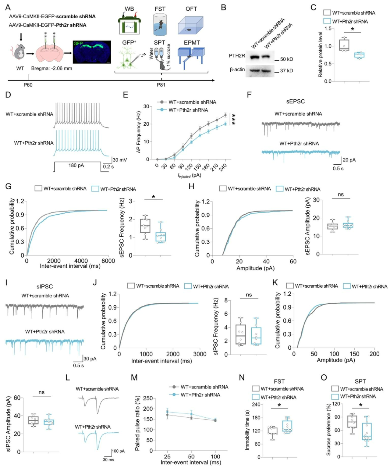 为验证PTH2R对dCA1神经元电生理及抑郁样行为的调控作用,研究通过在WT小鼠双侧dCA1区注射CaMKII启动子表达Pth2r-shRNA腺相关病毒(AAV)(Pth2r-shRNA组)(图7A)。3周后,Westernblot证实PTH2R蛋白水平显著下降(图7B、C);电生理记录显示,Pth2r-shRNA组小鼠的神经元放电频率降低(图7D、E),sEPSC频率下降而sIPSC无变化(图7F-K),且PPR未受影响(图7L、M),表明其可特异性损害神经元兴奋性与谷氨酸能传递。行为学实验中,Pth2r-shRNA组小鼠在FST中不动时间延长、SPT中蔗糖偏好率下降(图7N、O),表现出抑郁样行为。综上,dCA1区Pth2r敲低可重现Adcy8缺失引起的电生理与行为表型,PTH2R是Adcy8下游的关键效应分子。