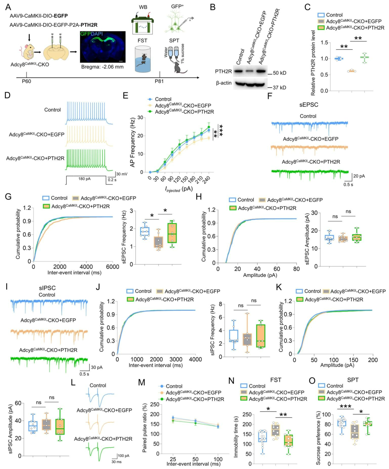 图8 过表达PTH2R可挽救Adcy8CaMKII-CKO小鼠的神经元兴奋性与谷氨酸能神经传递缺陷,并缓解其抑郁样行为。