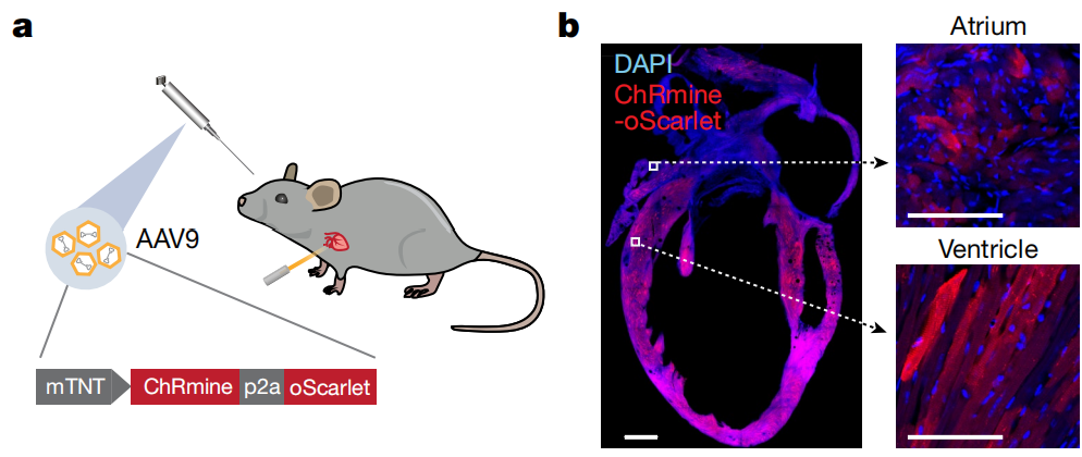 图4 a眶后静脉注射AAV9-mTNT-ChRmine-P2A-oScarlet示意图;b AAV病毒在心房、心室的感染效果图[4]