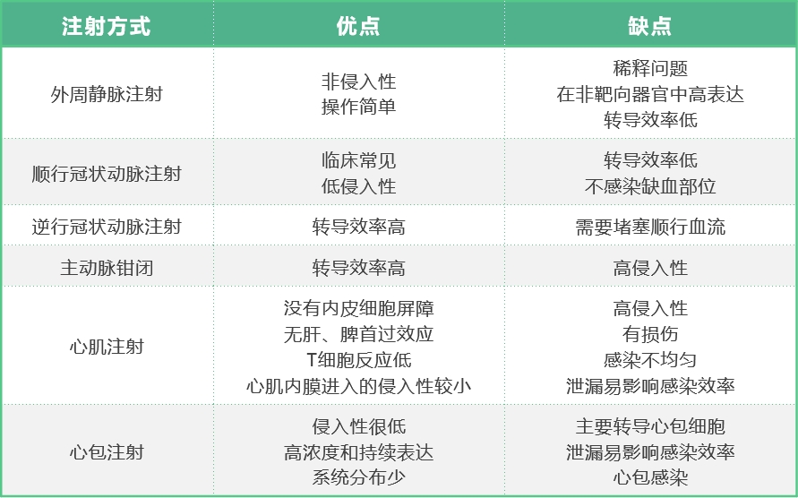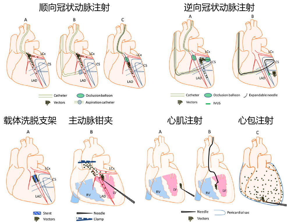 靶向心脏的基因递送有多种途径,如图2,具体选择取决于目标区域是整个心脏还是特定部位(如心肌梗死区)。若需转导整个心脏,可选择静脉注射、动脉注射或多次心肌内注射。而针对心脏的特定区域,则可以通过外部注射或直接在心内膜表面注射,以实现精准递送。