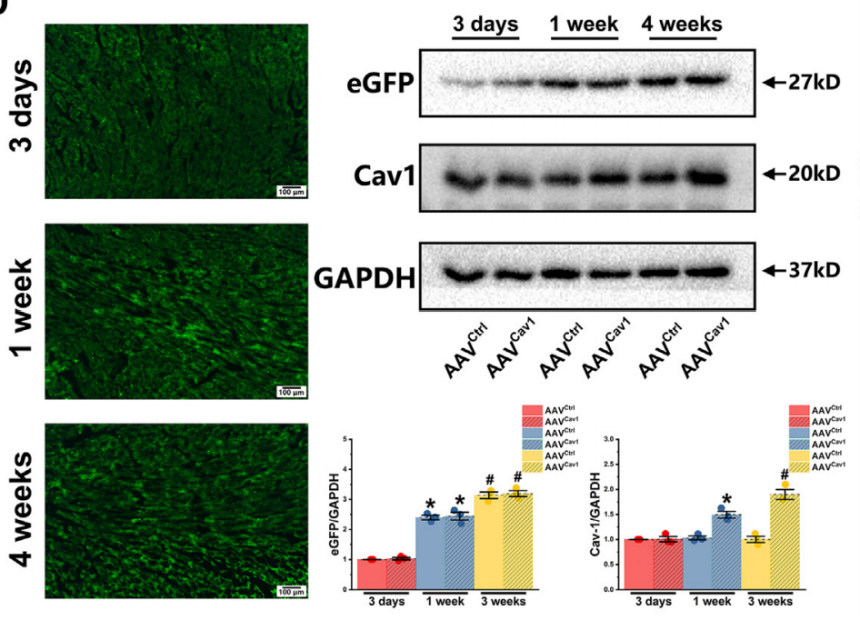 实验结果:为了实现心脏特异性Cav1过表达,大鼠心肌内注射AAV9介导表达的AAV9-cTNT-Cav1-EGFP,该病毒在心脏肌钙蛋白T(cTnT)启动子下介导表达Cav1,另外Sham对照组大鼠心肌内注射对照AAV9-cTNT-EGFP病毒,结果显示缺血性心肌病大鼠模型心脏特异性过表达Caveolin-1可改善心律失常和心脏重构。