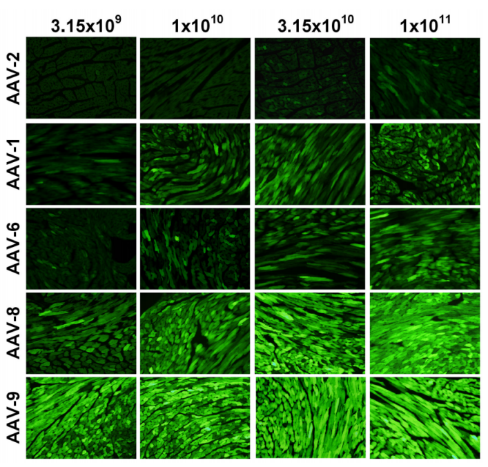 实验结果:使用荧光显微镜观察经不同血清型对应不同剂量AAV载体处理的小鼠心脏冷冻切片。AAV载体AAV-cTnT-eGFP分别包装于AAV血清型2、1、6、8和9的衣壳中,1周龄小鼠通过颈静脉注射相应剂量的病毒基因组,4周后,制备6 μm厚的心脏冷冻切片并进行荧光显微分析。结果显示,AAV9血清型相比其他血清型,能够更高效地转导心肌细胞,表现出更强的荧光信号。