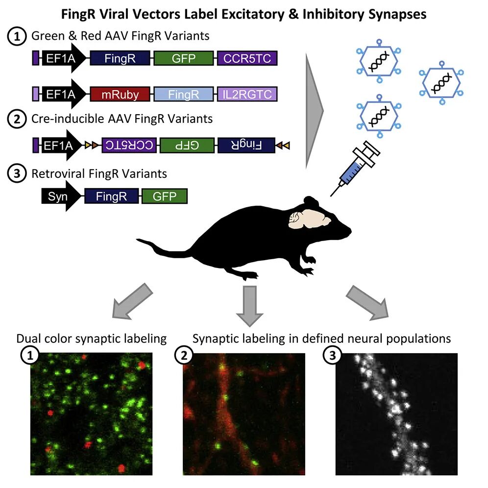 在神经科学领域,精确标记突触对于揭示神经计算原理、神经回路的连接性及其可塑性至关重要。然而,传统免疫组织化学技术虽然可以标记突触,却需要固定组织,这限制了对活组织的可视化,且难以准确识别特定细胞来源的突触。为了解决这些问题,Han Lab于2020年7月24日发表了研究成果《A Viral Toolbox of Genetically Encoded Fluorescent Synaptic Tags》。该研究利用mRNA展示技术生成的纤维连接蛋白内抗体,开发出一种病毒载体介导的遗传编码荧光突触标记工具——FingRs(Fibronectin intrabodies generated with mRNA display)。这些工具能够实现对大脑多个区域中兴奋性或抑制性突触的多色、神经元类型特异性标记,且不影响内源性突触蛋白的表达及突触传递功能。FingRs的应用不仅推动了对大脑功能及神经系统疾病的深入理解,也在监测新生神经元突触的发育及分析疾病模型中突触重组方面展现出广阔的应用前景。