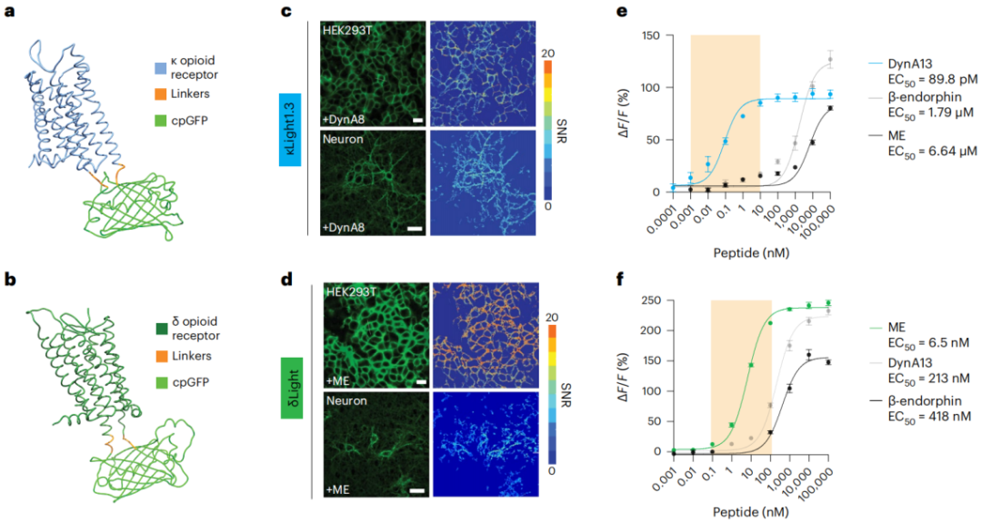 此外,研究人员对κOR的D3.22和δOR的D3.32结合区域进行了突变,以减弱配体的结合,产生了两个对照探针κLight0和δLight0。这三种探针在495 nm处的激发峰波长一致,在515 nm处的发射峰波长一致;原位滴定法显示,三种探针都能被三种不同的内源性阿片类肽激活(强啡肽、脑啡肽、β-内啡肽),但其效力和功效不同;κLight1.3和δLight对内源性阿片类多肽均具有选择性和敏感性,µLight特异性较低。κLight对强啡肽DynA13的半数有效浓度(EC50)达到了89.8 pM,而δLight对甲硫氨酸脑啡肽ME的EC50为6.5 nM。κLight1.3对β-内啡肽的荧光变化最高(ΔF/F=126.9%±8.6%),其次是DynA13和ME (ΔF/F=93.6% ± 3.9%;ΔF/F=80.3%±1.8%);δLight对ME的荧光相应度最高(ΔF/F= = 246.1% ± 4.6%),其次是DynA13和β-endorphin。