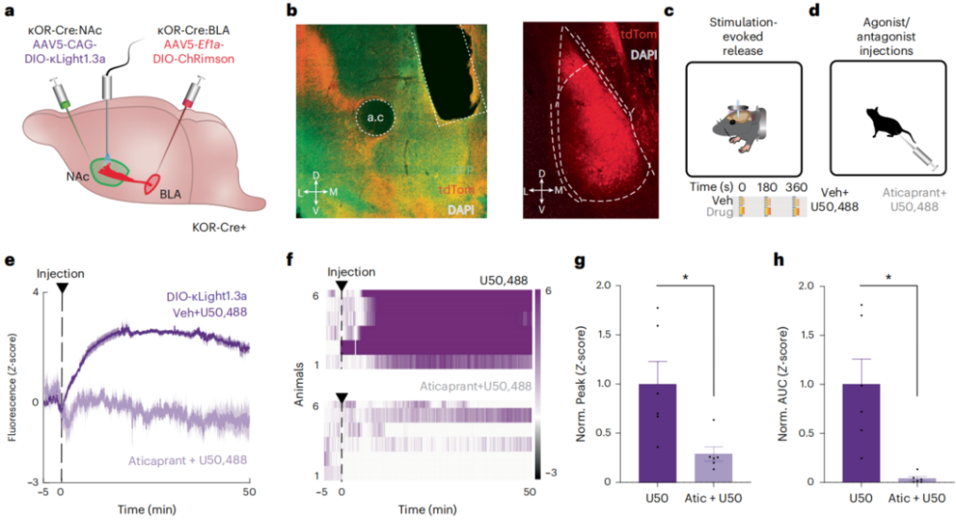 虽然光遗传学已被广泛用于触发神经肽的释放和神经活动,但在体内直接监测由光遗传刺激触发的肽释放尚未被光学测量,特别是以神经环路形式的高时间分辨率的方式。NAc含有丰富的强啡肽,先前的研究表明,靶向伏隔核壳(NAcSh)的Dyn-κOR系统可以调节奖赏和厌恶行为。研究还表明,基底外侧杏仁核(BLA)向NAcSh发送密集的、功能性的兴奋性投射,并且这些终末对Dyn-κOR的调节很敏感。为了验证光遗传刺激特定神经回路是否可以有效地触发内源性阿片肽的释放,并且通过基因编码的生物传感器进行实时监测,研究人员利用光遗传学工具,通过向小鼠的BLA注射含有红色光敏感蛋白ChRimson的AAV病毒,同时在NAcSh注射含有κLight1.3a的AAV病毒,以实现对特定神经回路的光遗传控制和监测。给一个1s、20HZ、5ms脉宽的光刺激后,κLight1.3a荧光显著增加。药物特异性的验证结果表明,阿片受体拮抗剂能够显著降低光刺激引起的传感器激活,而激动剂预处理则减少了光刺激引起的传感器激活,这表明光刺激引起的传感器激活是由于内源性强啡肽的释放。