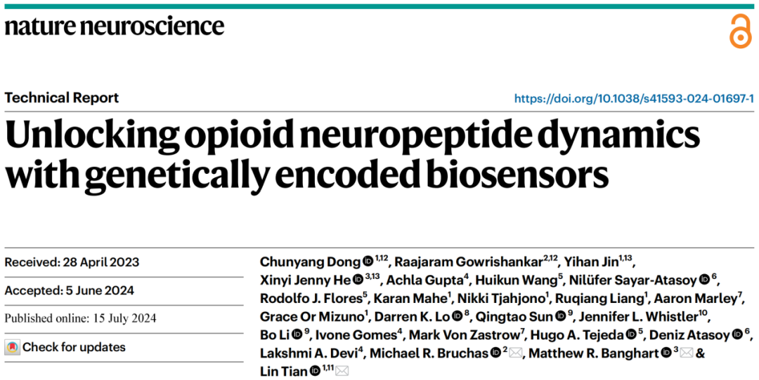 2024年7月15日,加州大学戴维斯分校Lin Tian实验室与华盛顿大学Michael R. Bruchas实验室和加州大学圣地亚哥分校Matthew R. Banghart实验室在Nature Neuroscience杂志在线发表了题为"Unlocking opioid neuropeptide dynamics with genetically encoded biosensors"的研究论文,该研究介绍了一种创新的荧光探针技术,这种技术基于基因编码,能够实时追踪和监测体内阿片肽的活性变化。