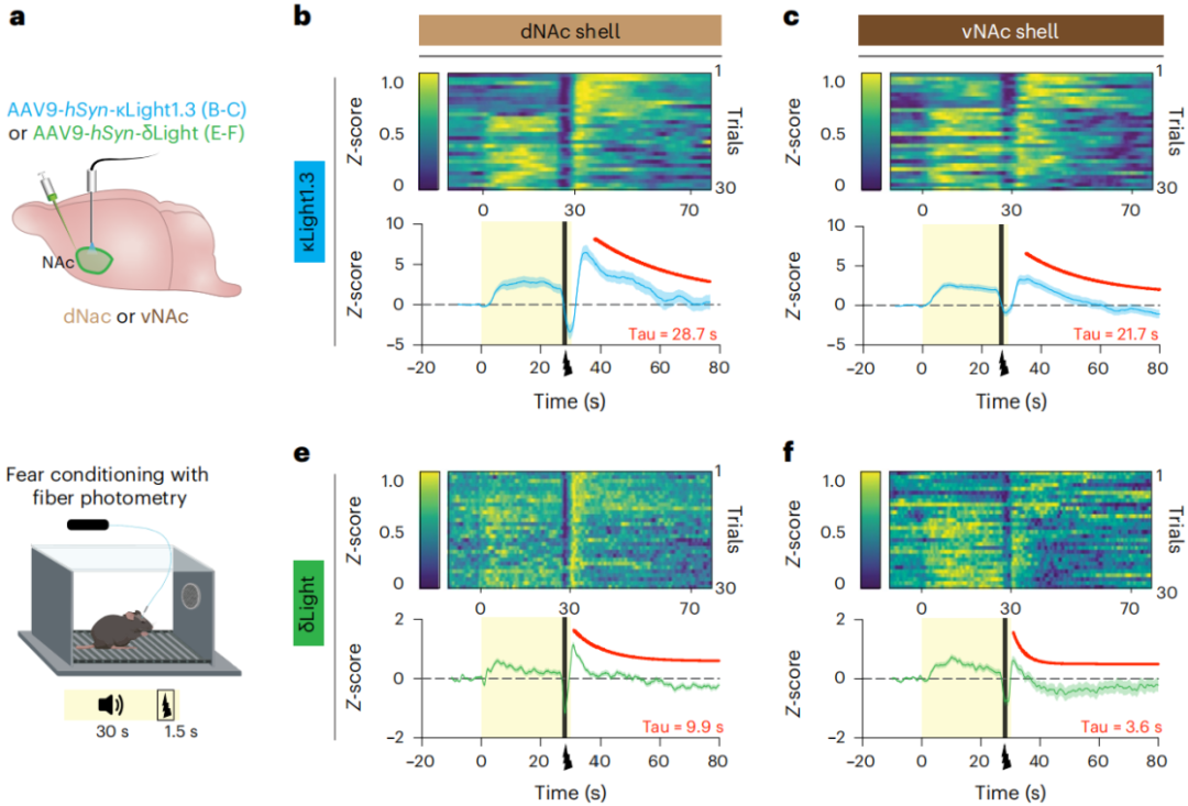 在成功检测到光遗传诱发的强啡肽释放后,接下来试图使用κLight和δLight监测恐惧和奖赏条件下行为动物的阿片类肽信号动力学。已经使用光学透析方法测量了vNAc和dNAc中亚区域特异性的强啡肽和脑啡肽的释放,因此,研究人员决定研究κLight1.3和δLight在探索恐惧学习过程中NAc亚区中阿片类肽的特异性释放方面的效用。在dNAc和vNAc中分别注射AAV9-hSyn-κLight1.3或AAV9-hSyn-δLight,然后植入光纤。在给小鼠电刺激诱导恐惧时,无论是dNAc和vNAc都观察到κLight1.3探针荧光强度的快速上升,40s后,荧光信号逐渐下降至基线水平;足部电击能引发dNAc中δLight探针大规模的荧光增加,然后在电击超过10秒后急剧衰减。总之,数据表明κLight和δLight可以真实地报告在恐惧学习过程中触发的内源性阿片肽释放的亚区域差异。此外,研究人员还发现κLight和δLight也能监测奖赏行为NAc亚区阿片肽的释放。总之,这些结果表明,κLight和δLight可以准确地指示恐惧和奖赏行为的全过程中内源性阿片肽释放的动态变化。