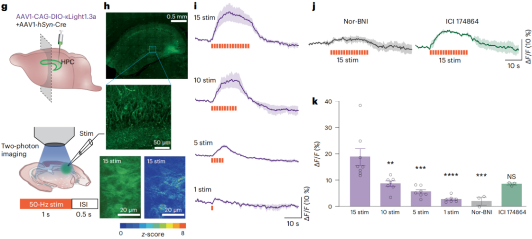 为了提高κLight1.3探针的基础荧光亮度,研究人员通过引入新的连接子(CYKIWRNFKGK和SVISKAKIRTV)来改进探针,生成了新的变体κLight1.3a。这个新变体在保持相似的动态范围的同时,基础亮度提高了2倍以上。研究人员在小鼠的CA3区域表达了κLight1.3a探针,通过AAV病毒载体将探针与Cre重组酶共表达,以实现特定神经元群体的标记。利用双光子成像技术,研究人员在活体脑片中能观察了κLight1.3a在神经元轴突和突触的分布,并在电刺激后监测到荧光变化。通过改变电刺激的参数(如刺激次数、激光强度和刺激时间),研究人员确定了能够最有效地触发内源性阿片肽释放的刺激条件。他们发现,以频率50次/秒,间隔是0.5秒的电刺激作用于CA3脑区,κLight1.3a探针荧光会持续增加,并在刺激停止后迅速衰减;随着刺激数量的增加,荧光亮度也随之增强,这一反应可以被κ受体拮抗剂nor-BNI所抑制。