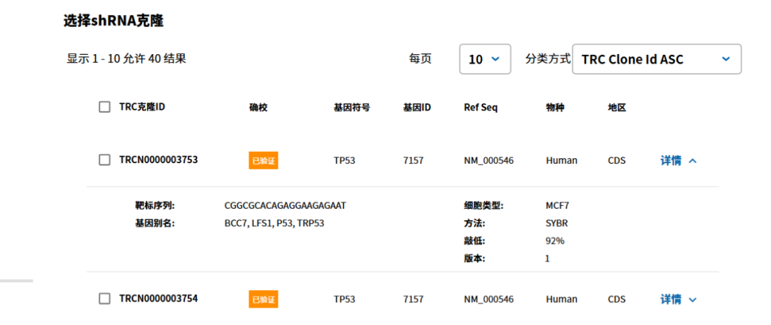 3.查看序列信息(网站中部分基因的shRNA序列经过验证,可以选择验证过且敲低效率较高的序列)。