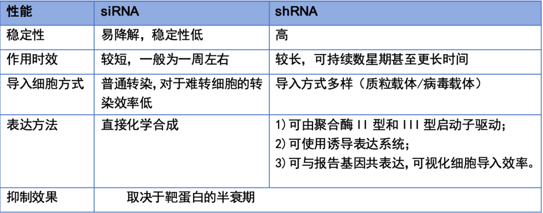 所以在设计RNA分子之前可根据实验目的选择siRNA或者shRNA,二者主要区别如下: