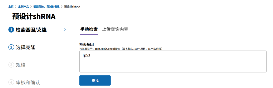 1.进入网站:https://www.sigmaaldrich.cn/CN/zh/semi-configurators/shrna?activeLink=productSearch 输入基因名称或Gene ID,点击查找。