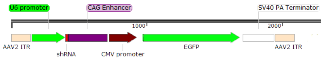 shRNA是一类小/短发夹的双链RNA,由于构建序列较短,需使用特定的pol III型启动子U6或者H1实现体内的表达。U6/H1启动子具有表达能力强,表达范围广等优点,常用于实现全脑区或组织内的基因干扰。以AAV病毒核心质粒为例,载体结构如下: