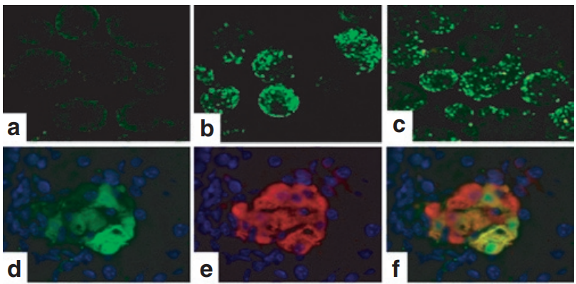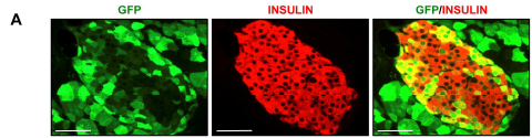 实验结果:小鼠胰岛素启动子(mIP)在dsAAV载体中显示是β细胞特异性,可以有效的让AAV介导绿色荧光蛋白(eGFP)在胰腺β细胞中特异性表达。在年轻雌性NOD小鼠中,dsAAV8-mIP-eGFP对胰腺β细胞的感染效率以及介导eGFP的表达效率,与正常BALB/C小鼠一样,并且能实现β细胞中特异性表达。
