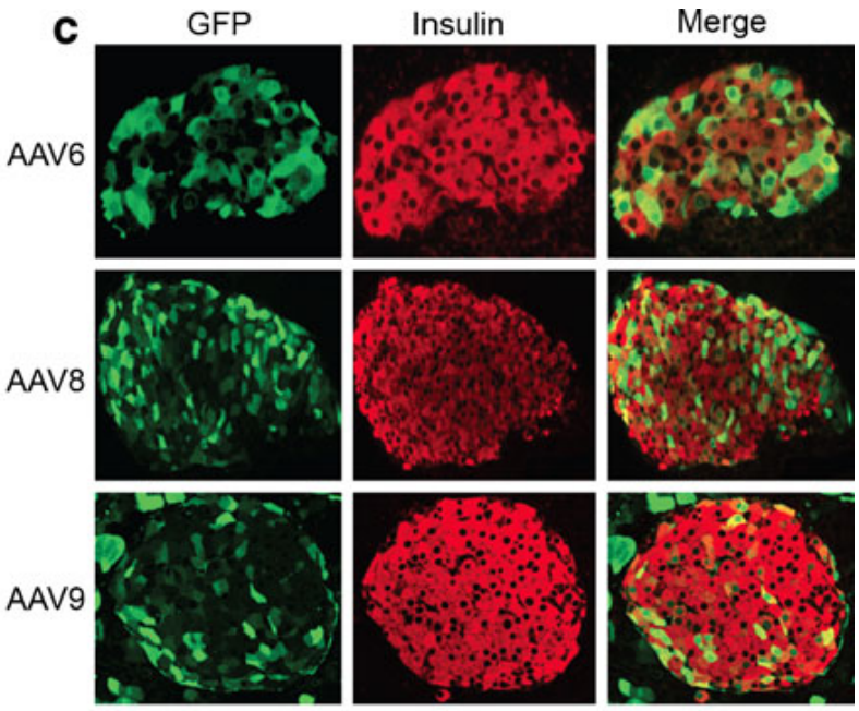 实例1:比较AAV6、AAV8和AAV9通过胰腺导管注射转导胰腺内分泌部的效率【1】