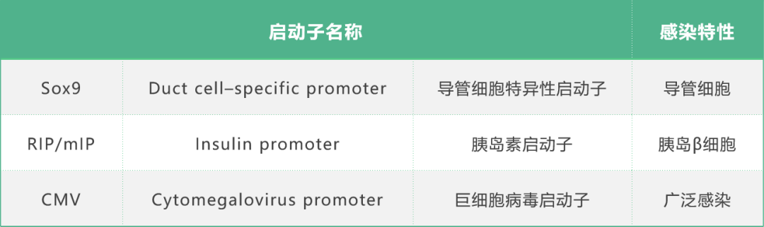 当将Sox9(导管细胞特异性)启动子介导Cre重组酶表达的AAV注入R26RTomato报告小鼠时,导管细胞可以被特异性和有效地标记。注射RIP(胰岛素启动子)介导重组SMAD7表达的AAV时,会发现SMAD7在胰腺细胞中特异性过表达。注射CMV(巨细胞病毒启动子)介导GFP表达的AAV时,会发现GFP在整个胰腺中表达。